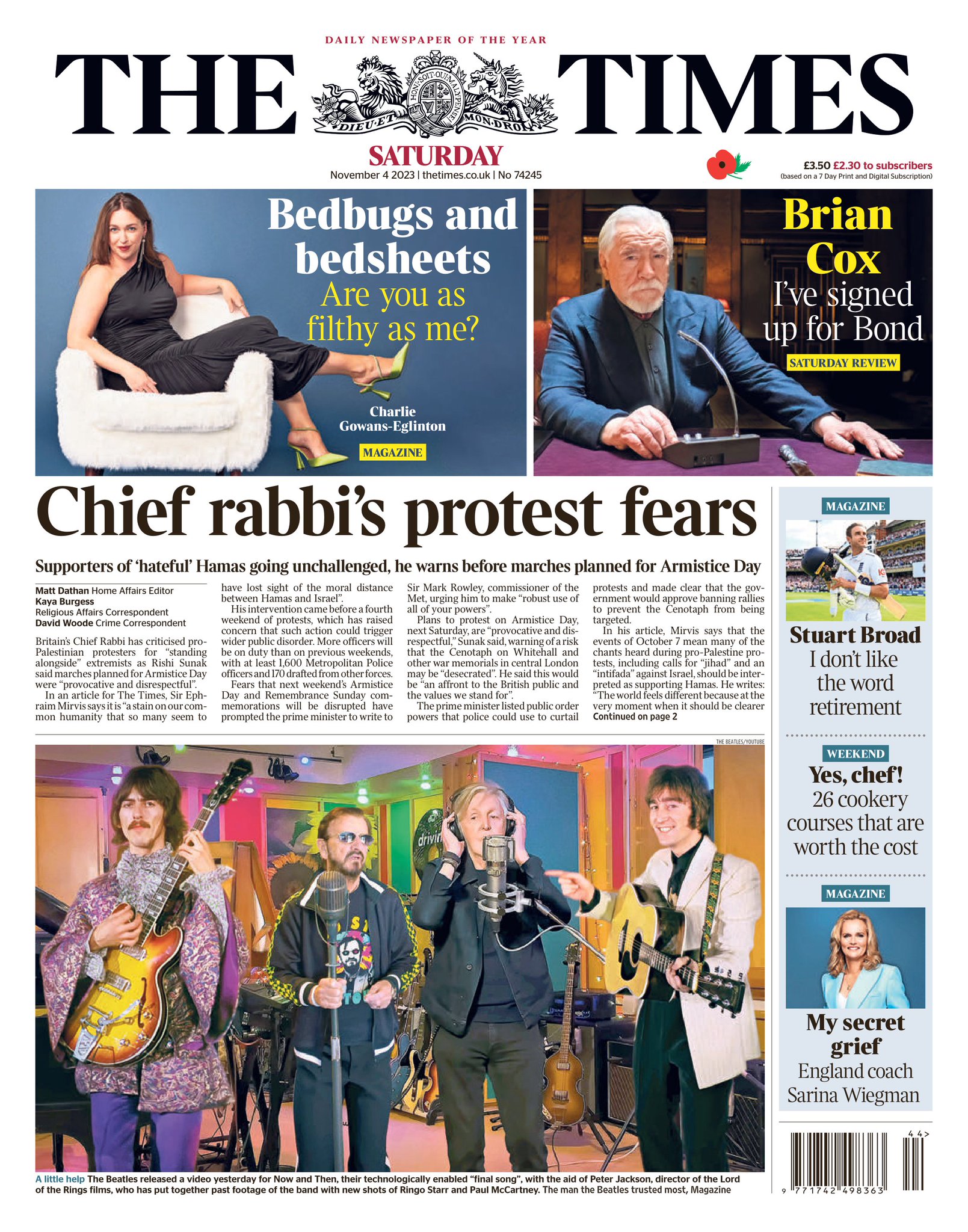 The Times reports on the UK Chief Rabbi’s worries about pro-Palestinian protesters aligning with Hamas extremists.