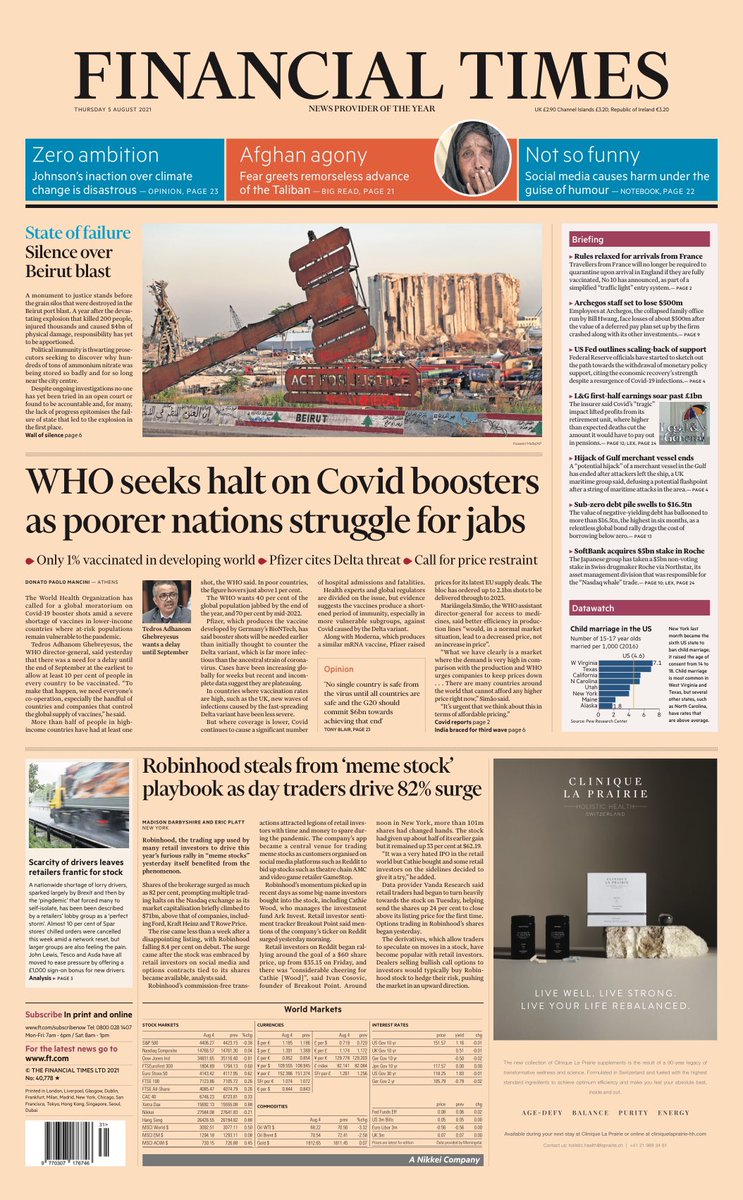 The Financial Times leads with the World Health Organization’s plea for a halt on COVID boosters while poorer nations struggle for vaccines.