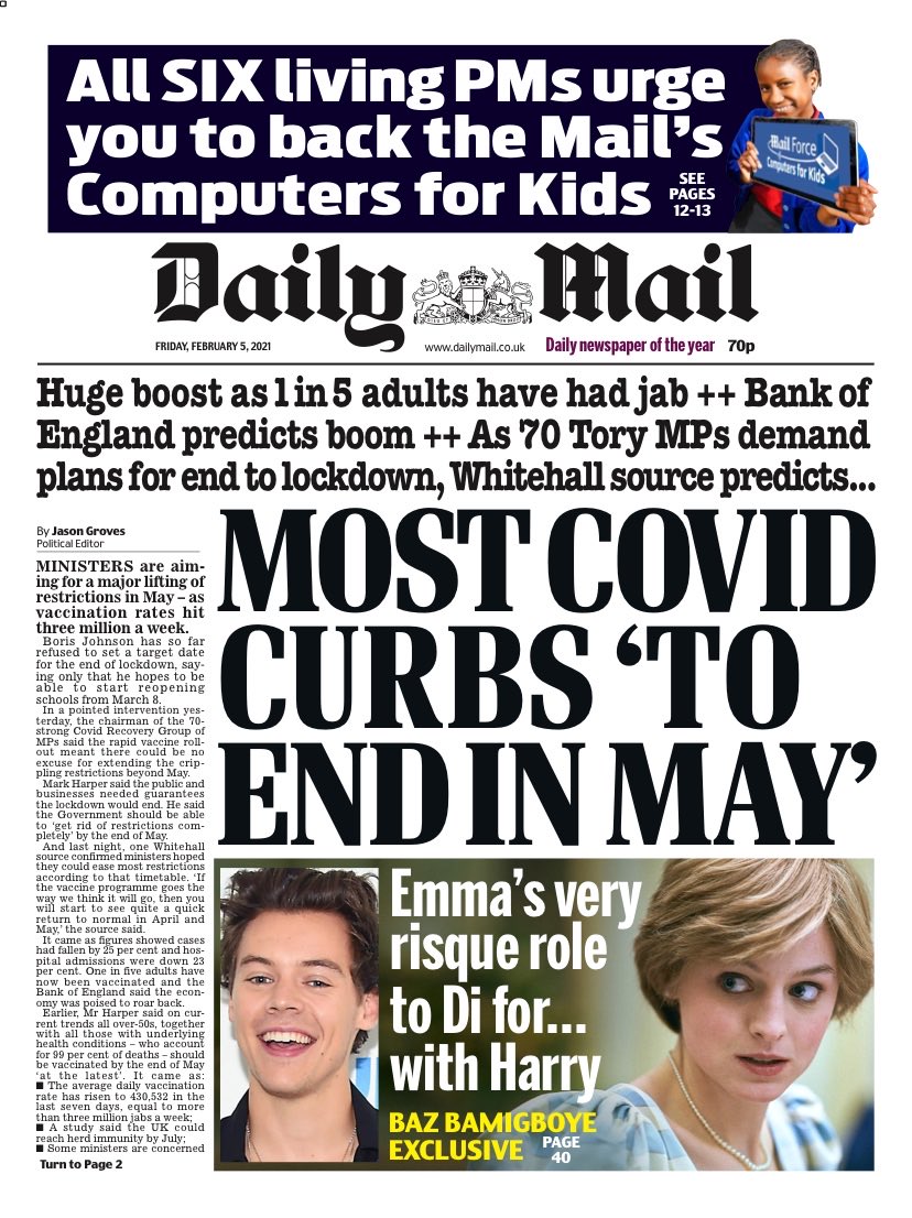 The Daily Mail reports that most coronavirus-related restrictions could disappear in May, as vaccinations reach three million per week.