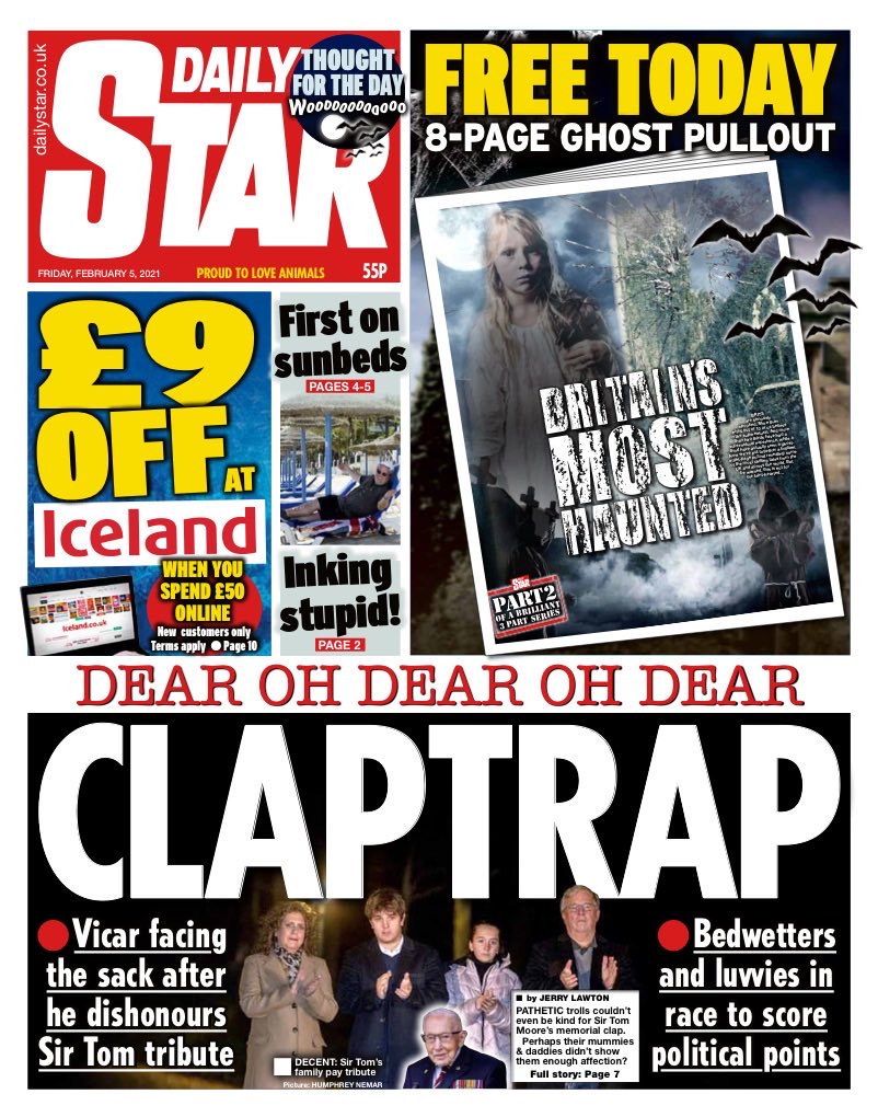 The Daily Star leads with the trolls’ responses to the memorial clap for Captain Sir Tom Moore, the NHS fundraiser who died with COVID-19 this week.