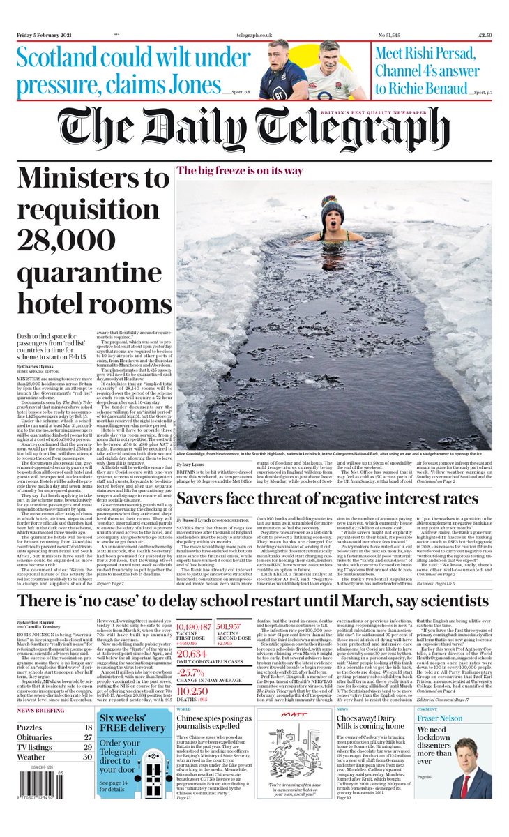 The government faces a race to reserve more than 28,000 hotel rooms before the launch of the “red list” quarantine scheme – that’s on the front of The Daily Telegraph.