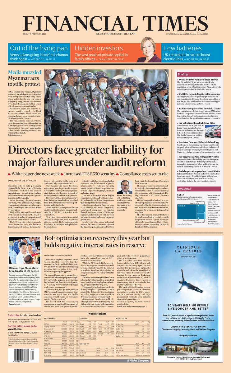 The Financial Times leads with a proposal to hold directors personally responsible for the accuracy of their company’s financial statements.
