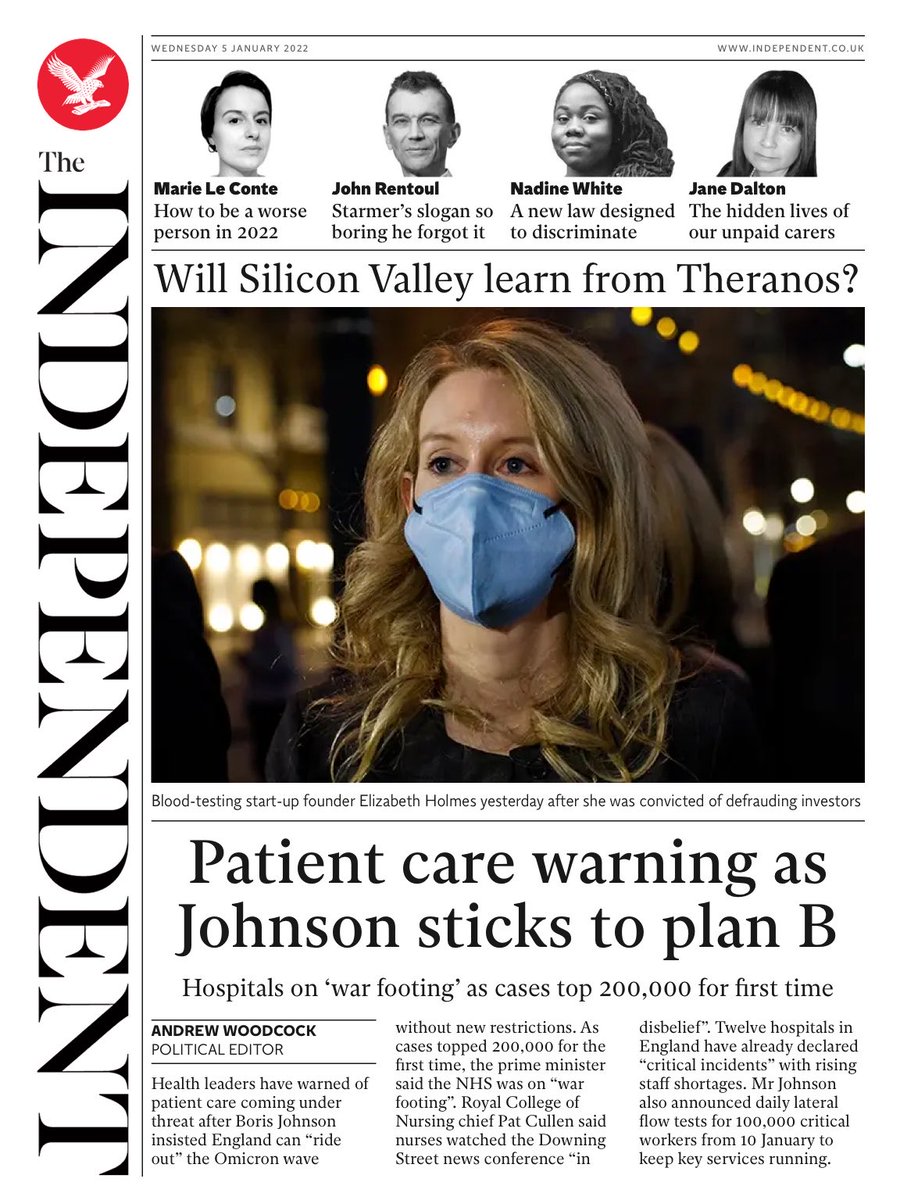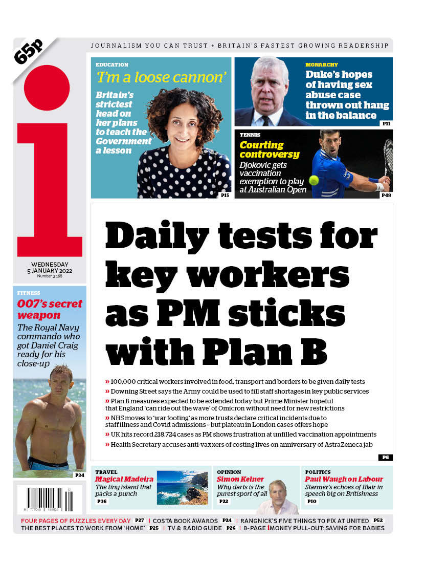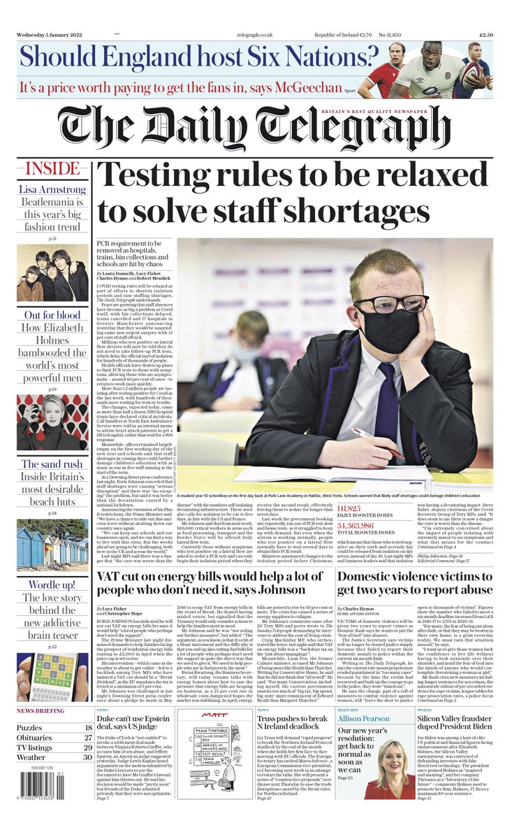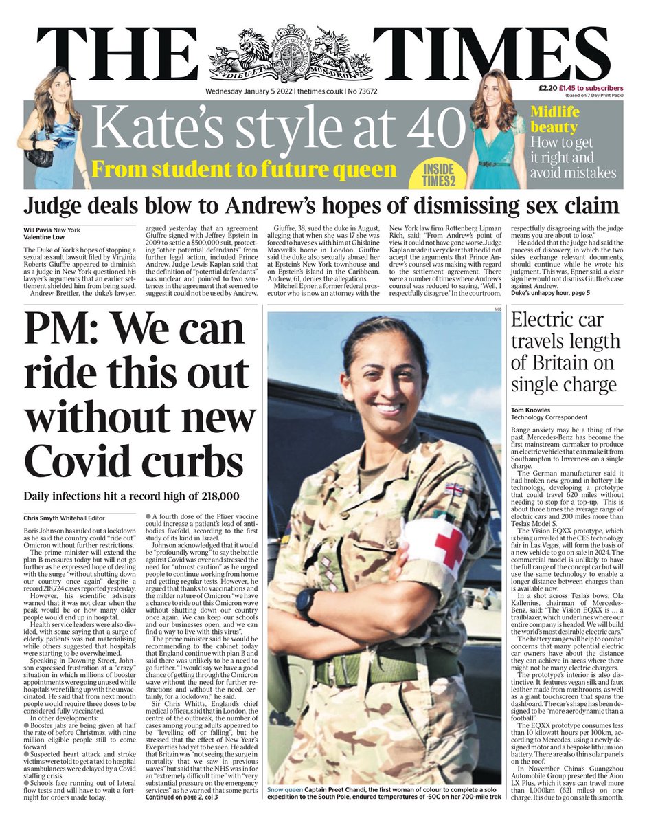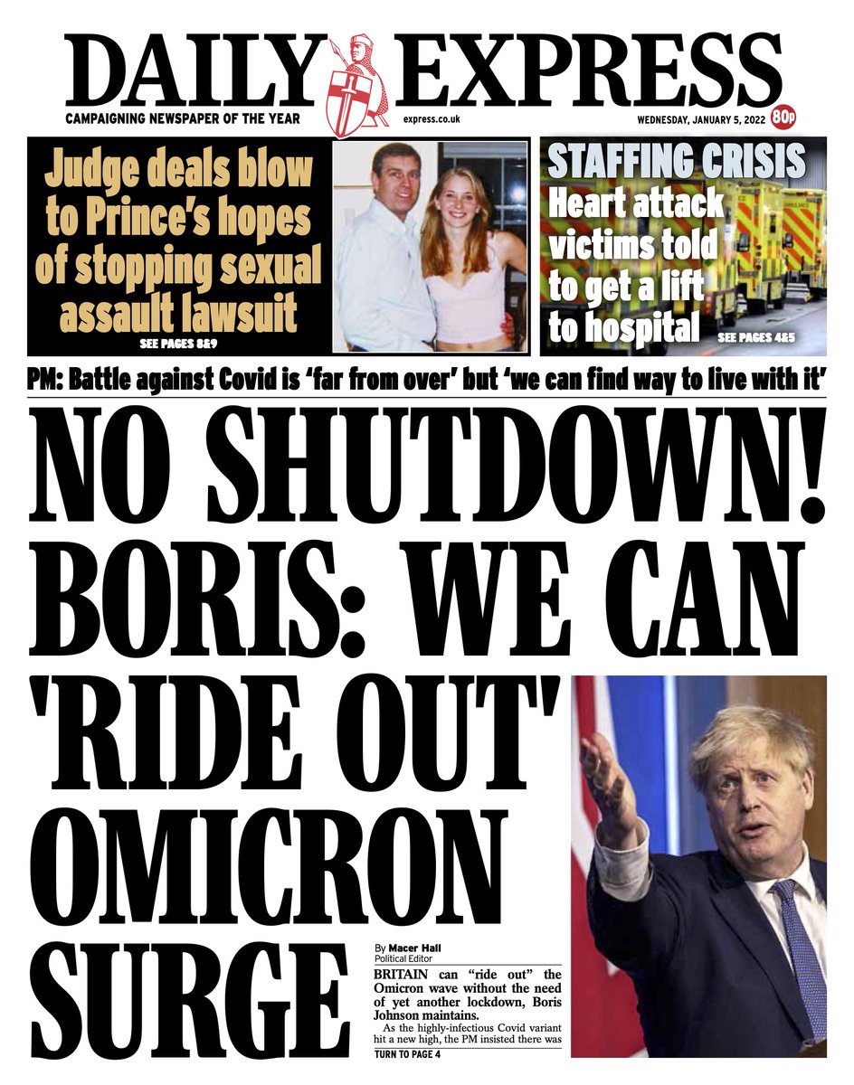 Boris Johnson’s decision to stick to Plan B coronavirus rules and not bring in new restrictions to deal with Omicron is the lead in The Times.es