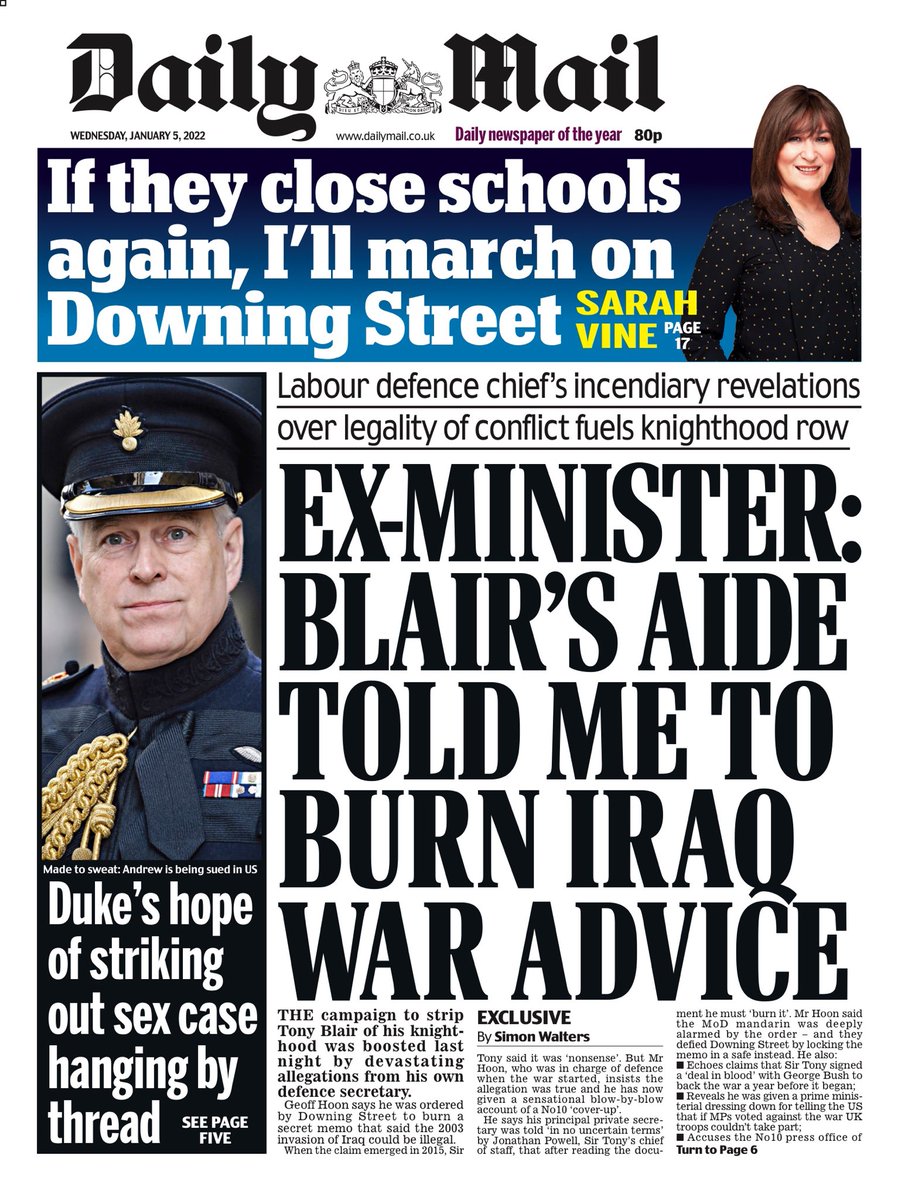 Former defence secretary Geoff Hoon has claimed an aide to Tony Blair told him to burn a “secret memo” that said the invasion of Iraq could be illegal, the Mail reports.