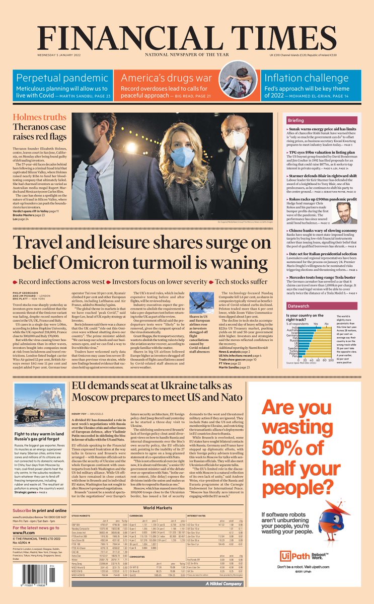 The FT says shares in travel and leisure firms have surged due to a feeling that the disruption caused by Omicron may be “waning” despite record cases numbers in some countries.