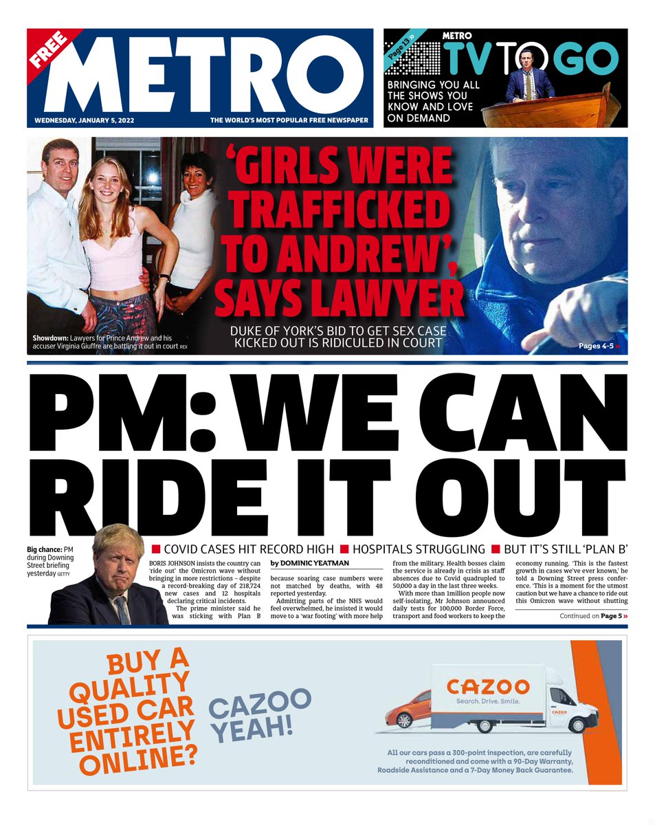 Metro focuses on Boris Johnson’s belief that the UK can “ride out” the current coronavirus wave without needing any more restrictions.op