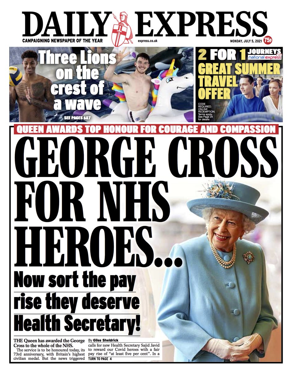 The Daily Express calls for NHS workers to get a pay rise, as it reports they are to receive the George Cross for their work during the pandemic.