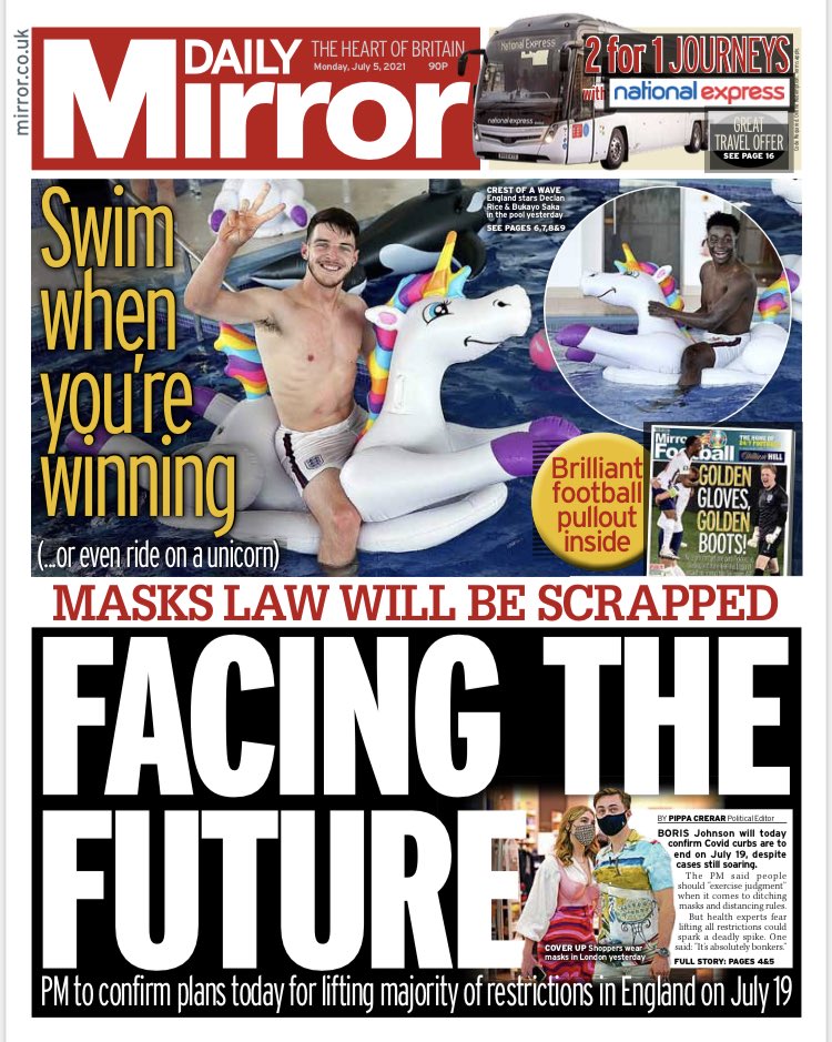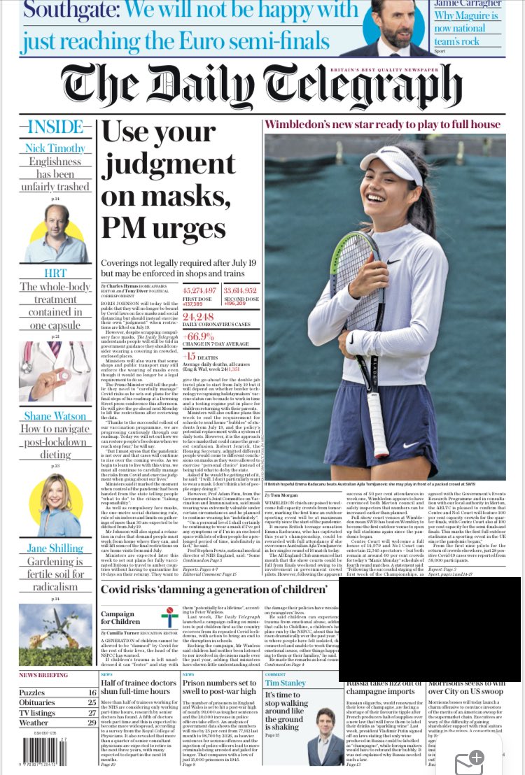 The Daily Telegraph reports that face masks will no longer be required after 19 July, although they may still be needed in shops and trains.