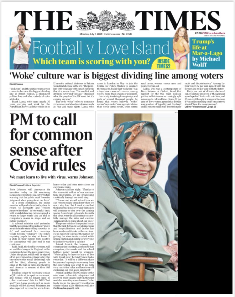 People will need to exercise their own judgment on mask wearing after restrictions are lifted on 19 July, the prime minister says in the Daily Mirror.