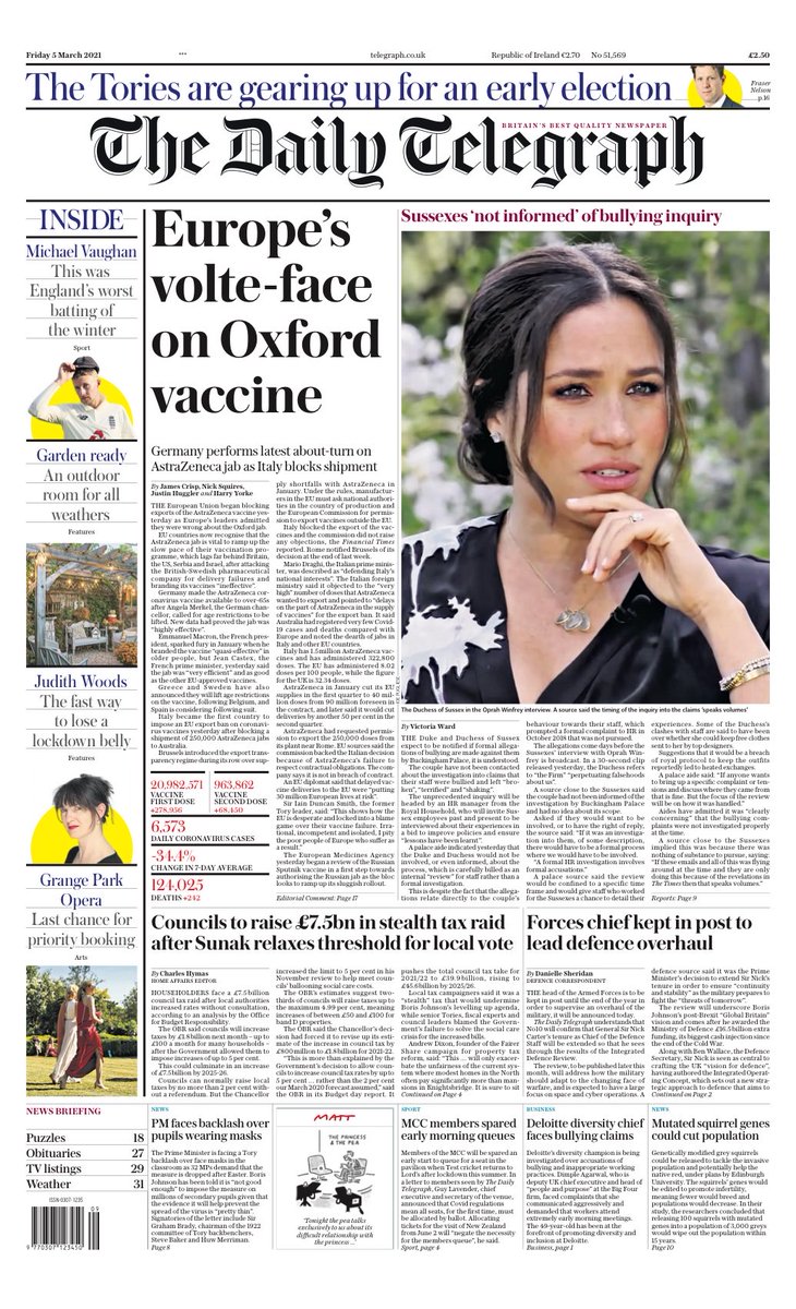 Proof that EU leaders have changed their minds over the Oxford/AstraZeneca COVID vaccine, says The Daily Telegraph, has come after they blocked exports of the jab to Australia.