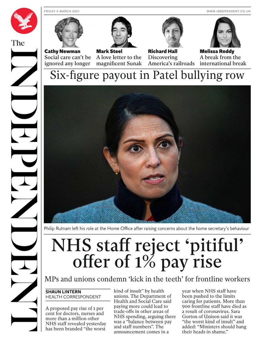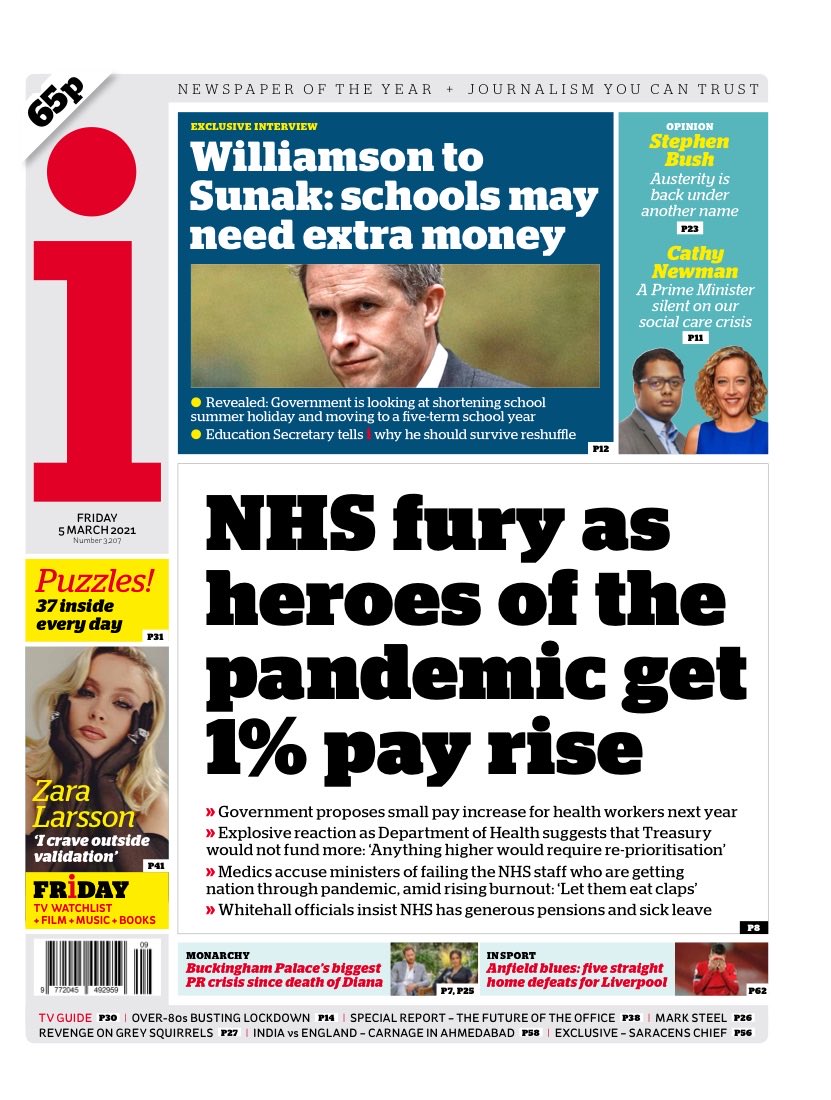 The i leads on next year’s rumoured offer of a 1% pay rise for NHS staff, calling the reaction to the news “explosive”.