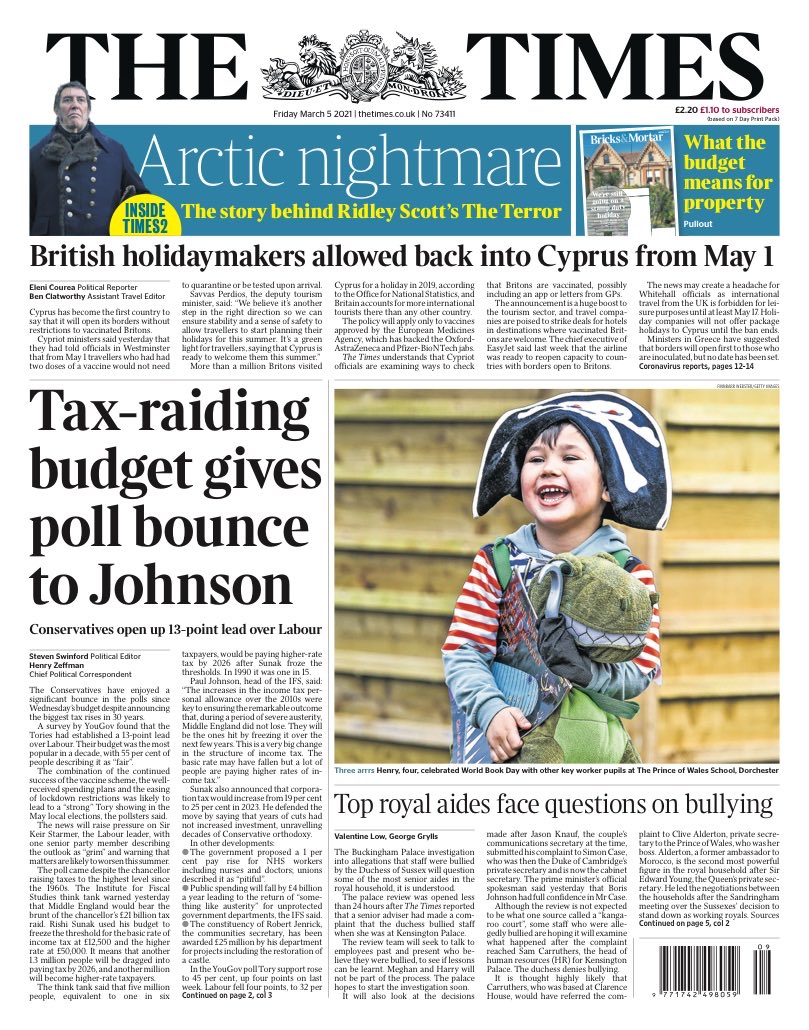 The budget has given the Conservatives a double-digit lead in the latest opinion poll – that’s the lead in The Times.