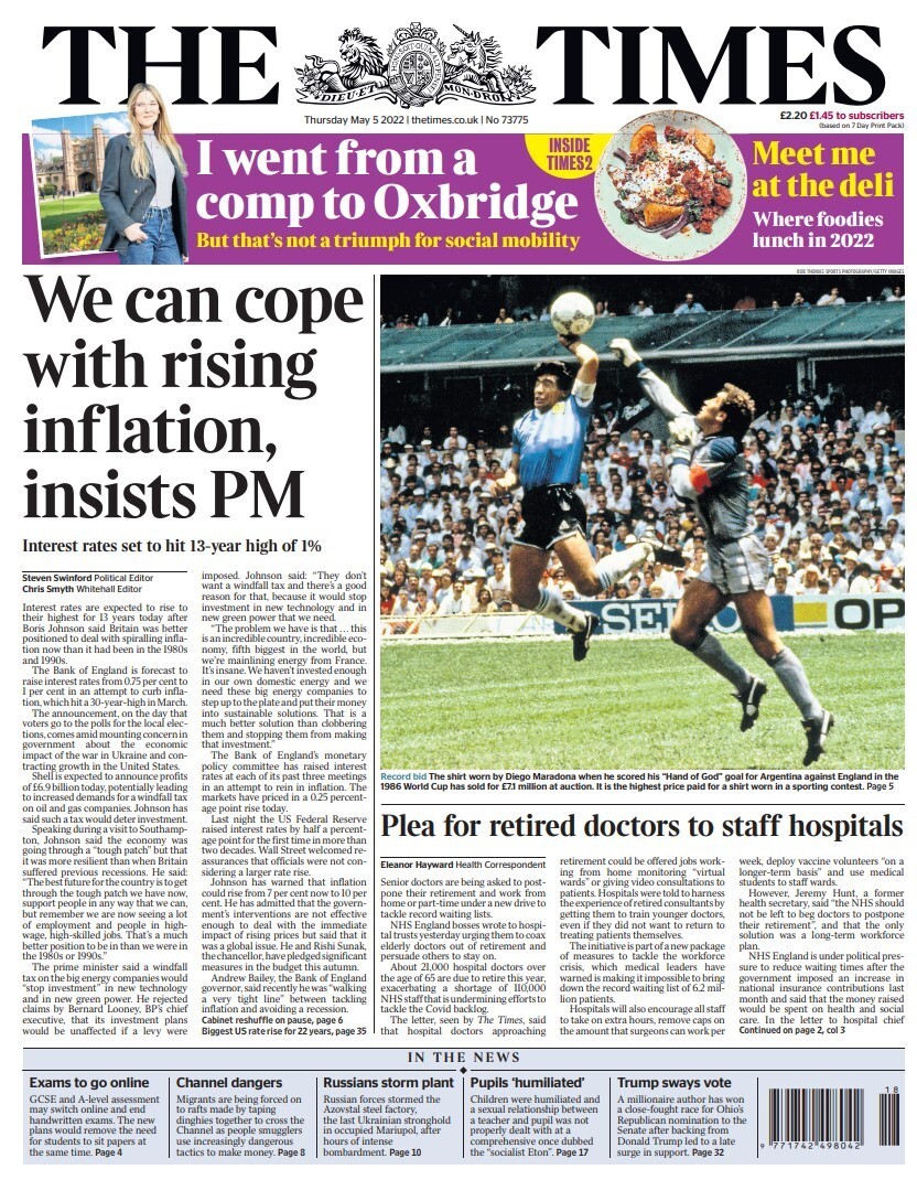 The Times reports that interest rates are expected to rise to their highest levels in 13 years after the PM said Britain is better equipped to deal with spiralling inflation now than it was in the 1980s and 1990s.