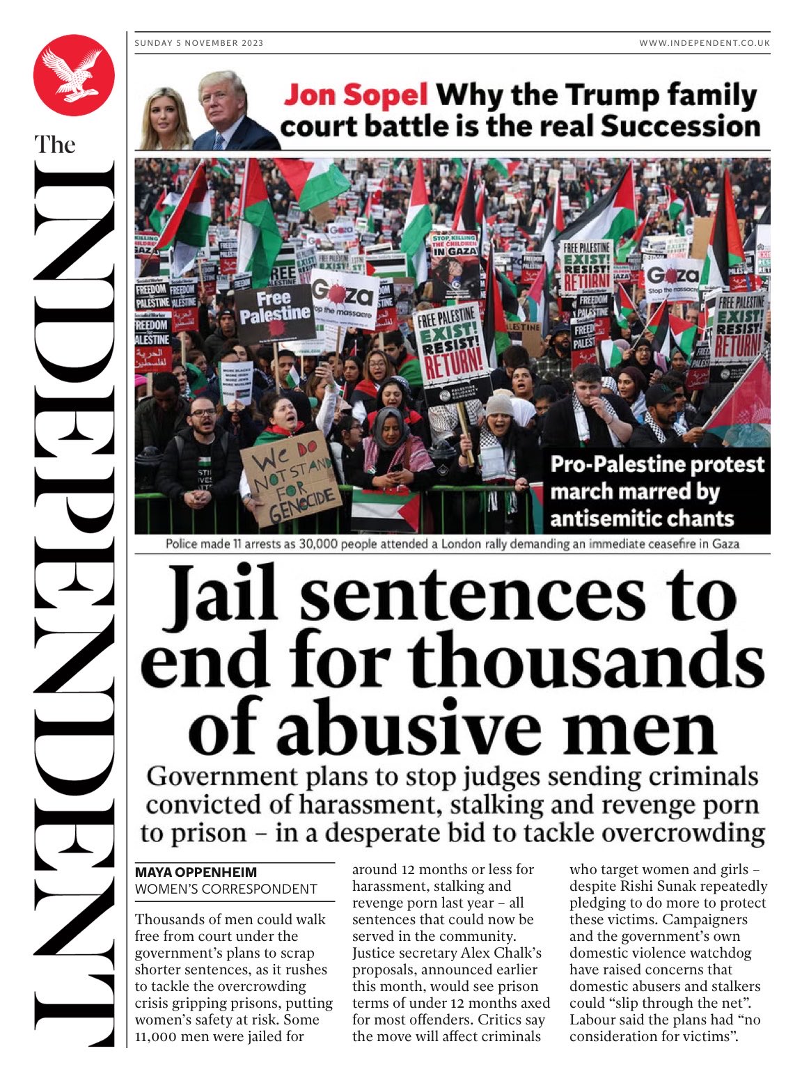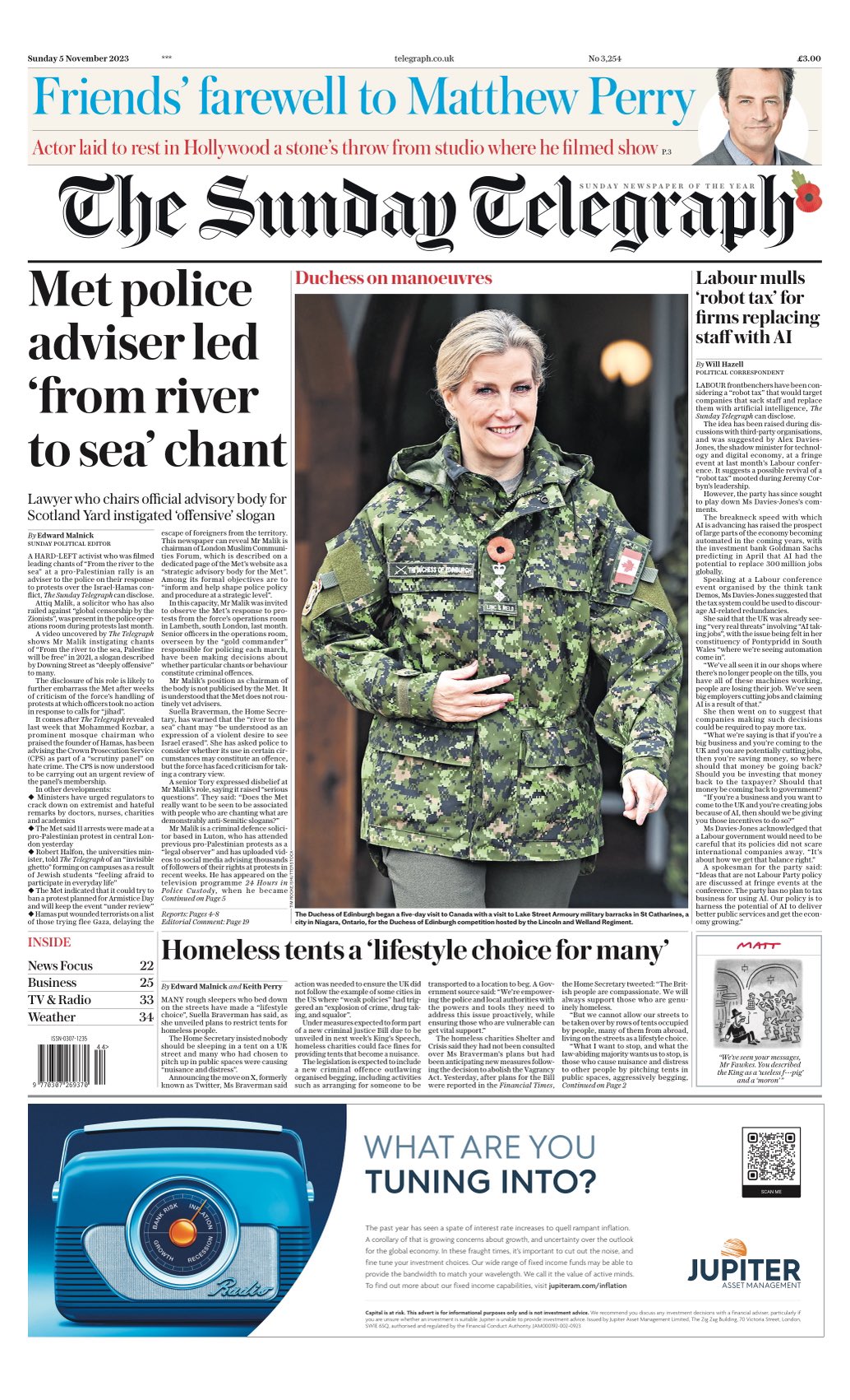 The Sunday Telegraph leads with the story of a lawyer, also an advisory body chair for Scotland Yard, filmed leading a contentious pro-Palestinian chant in 2021.