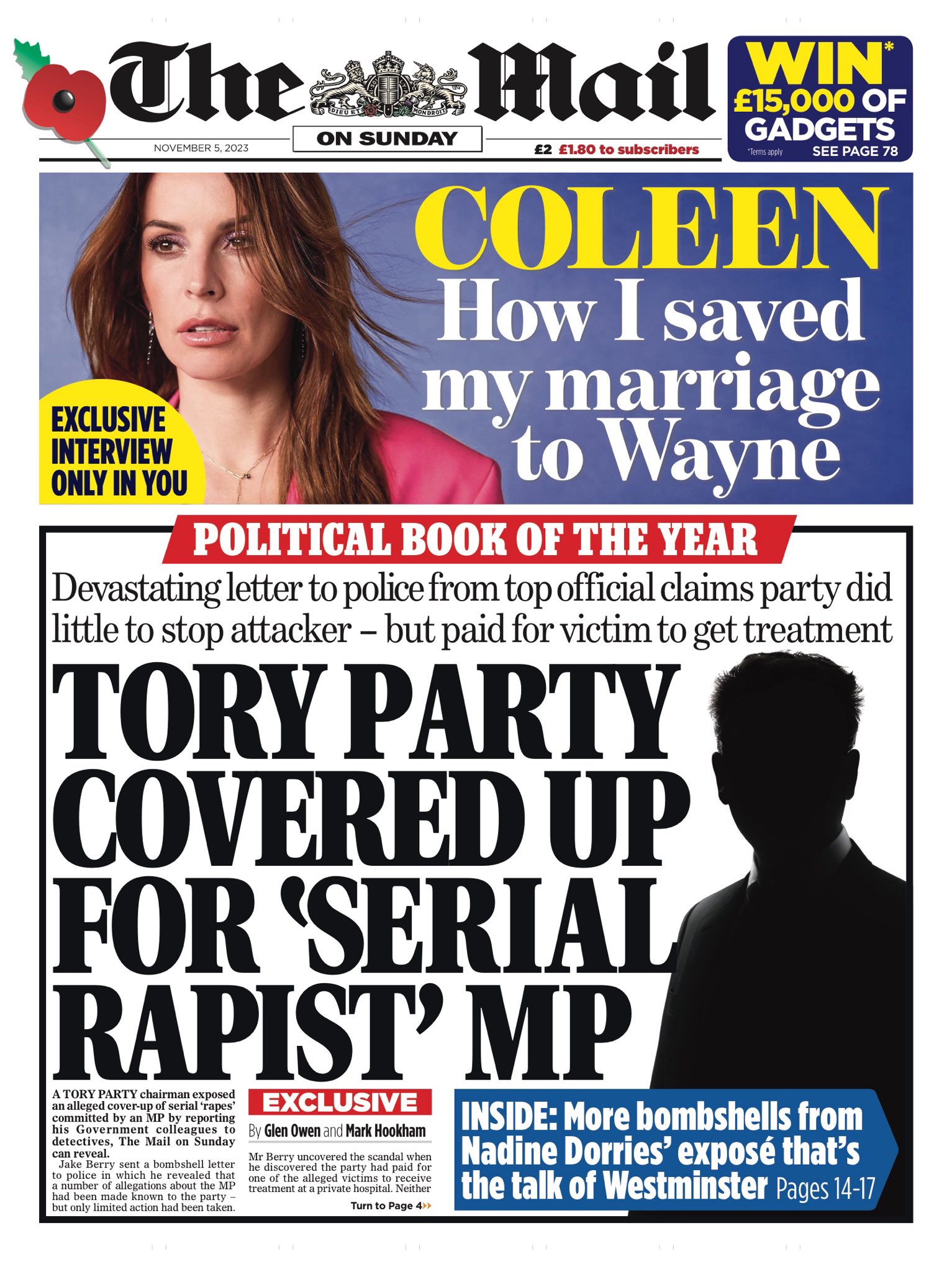 The Mail on Sunday features a lead story on allegations from Nadine Dorries’ book, the former Conservative MP.