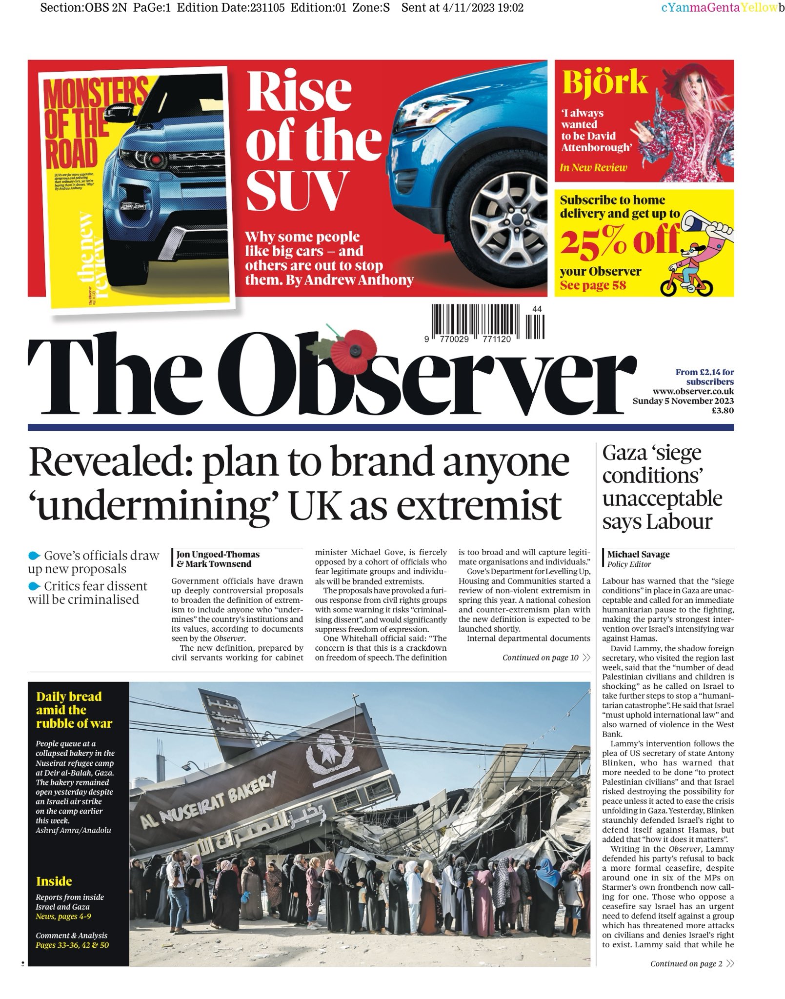 The Observer reports on potential government proposals to expand the ‘extremist’ classification to those ‘undermining’ UK values and institutions.