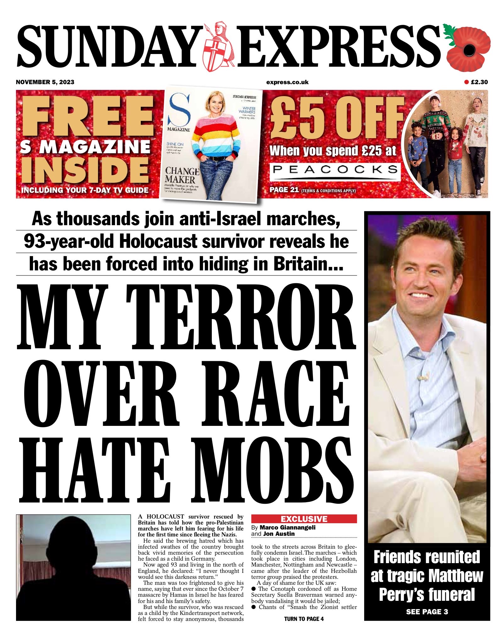 The Sunday Express reports on a 93-year-old Holocaust survivor driven into hiding due to fear sparked by pro-Palestinian marches in the UK.