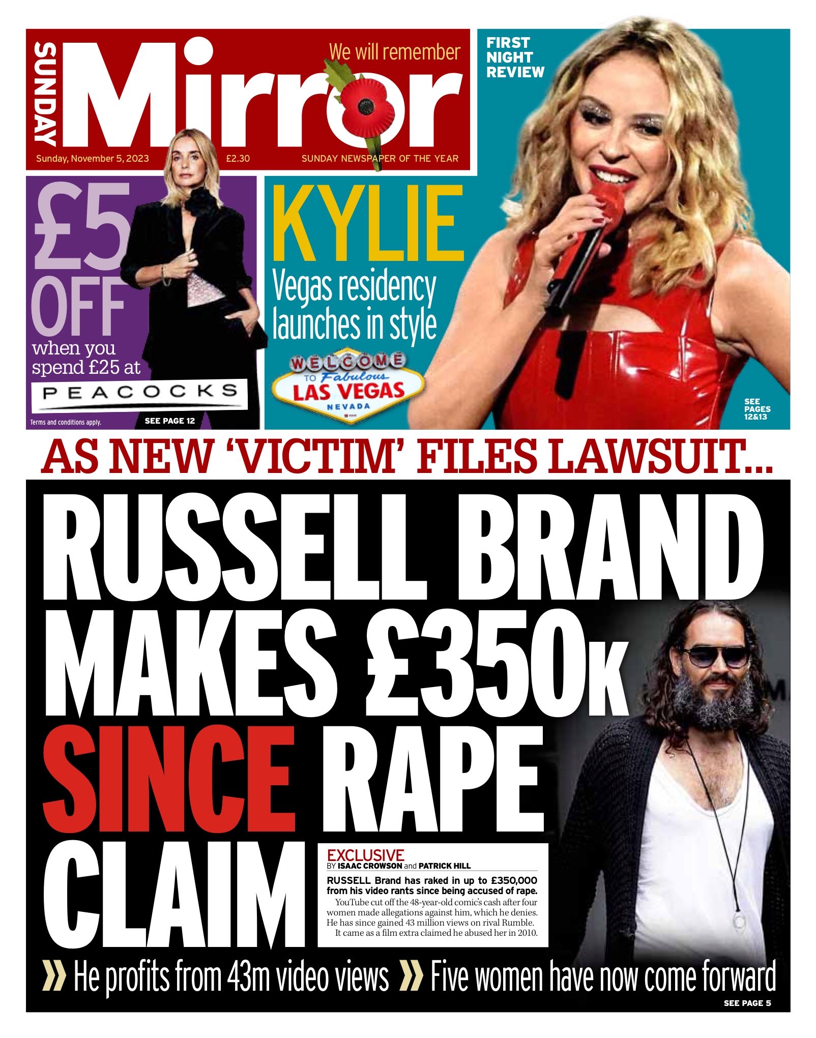 The Sunday Mirror reports on comedian Russell Brand’s alleged earnings of £350,000 from online videos amidst rape accusations.