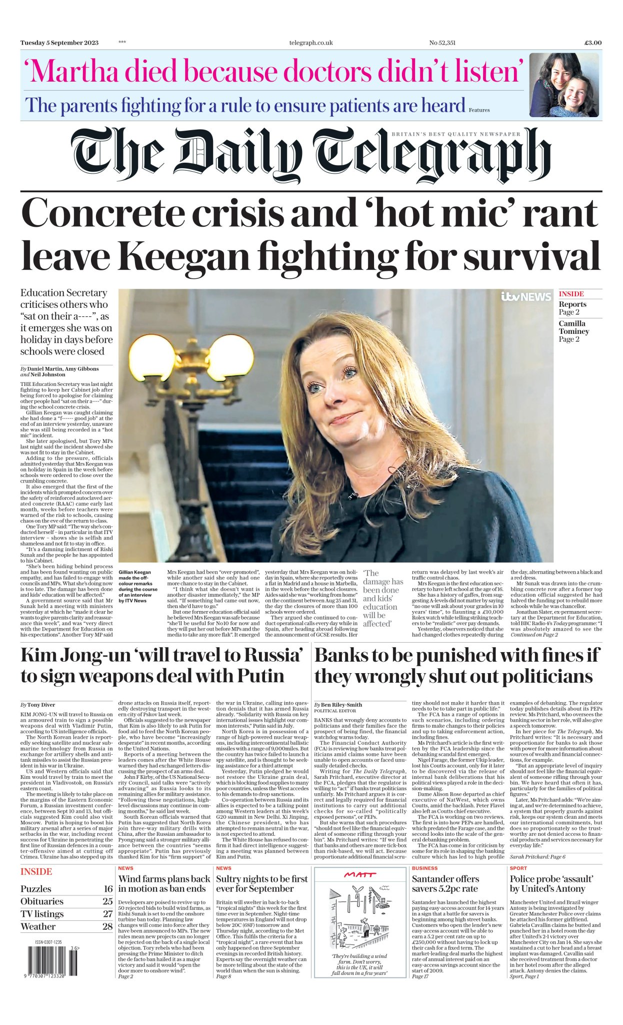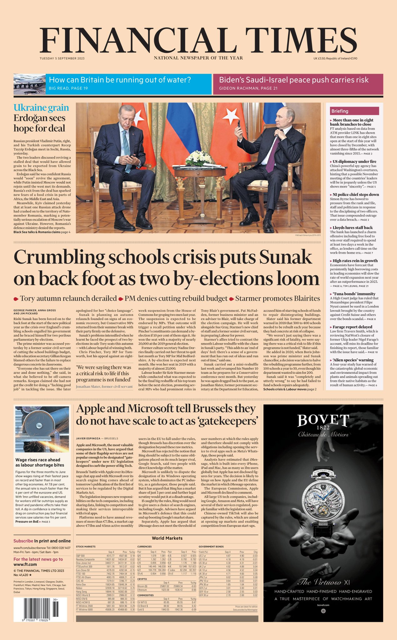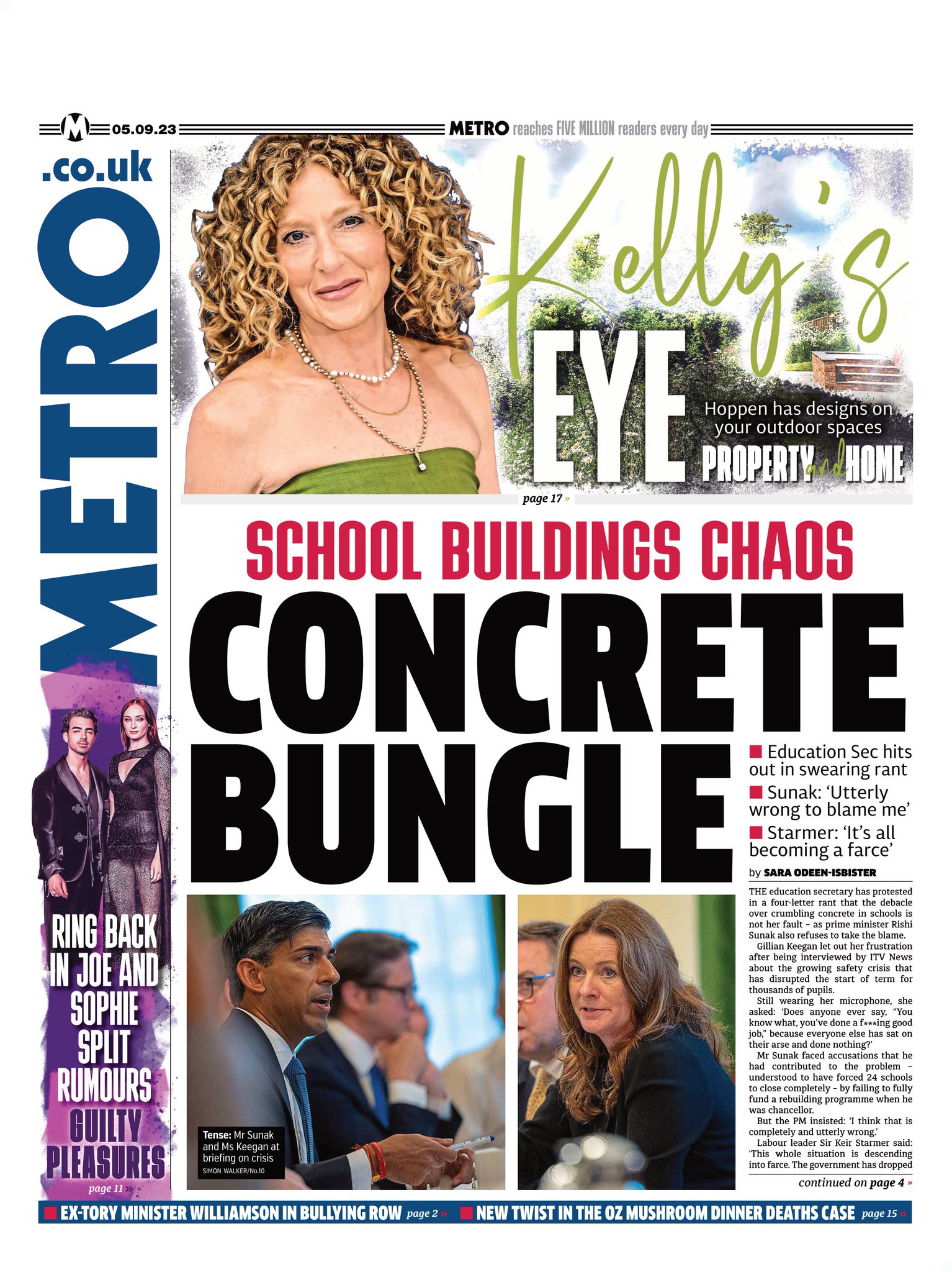 The Financial Times notes that the dilemma arising from the unsafe concrete issue has put Rishi Sunak in a defensive position, especially with two upcoming by-elections this autumn.