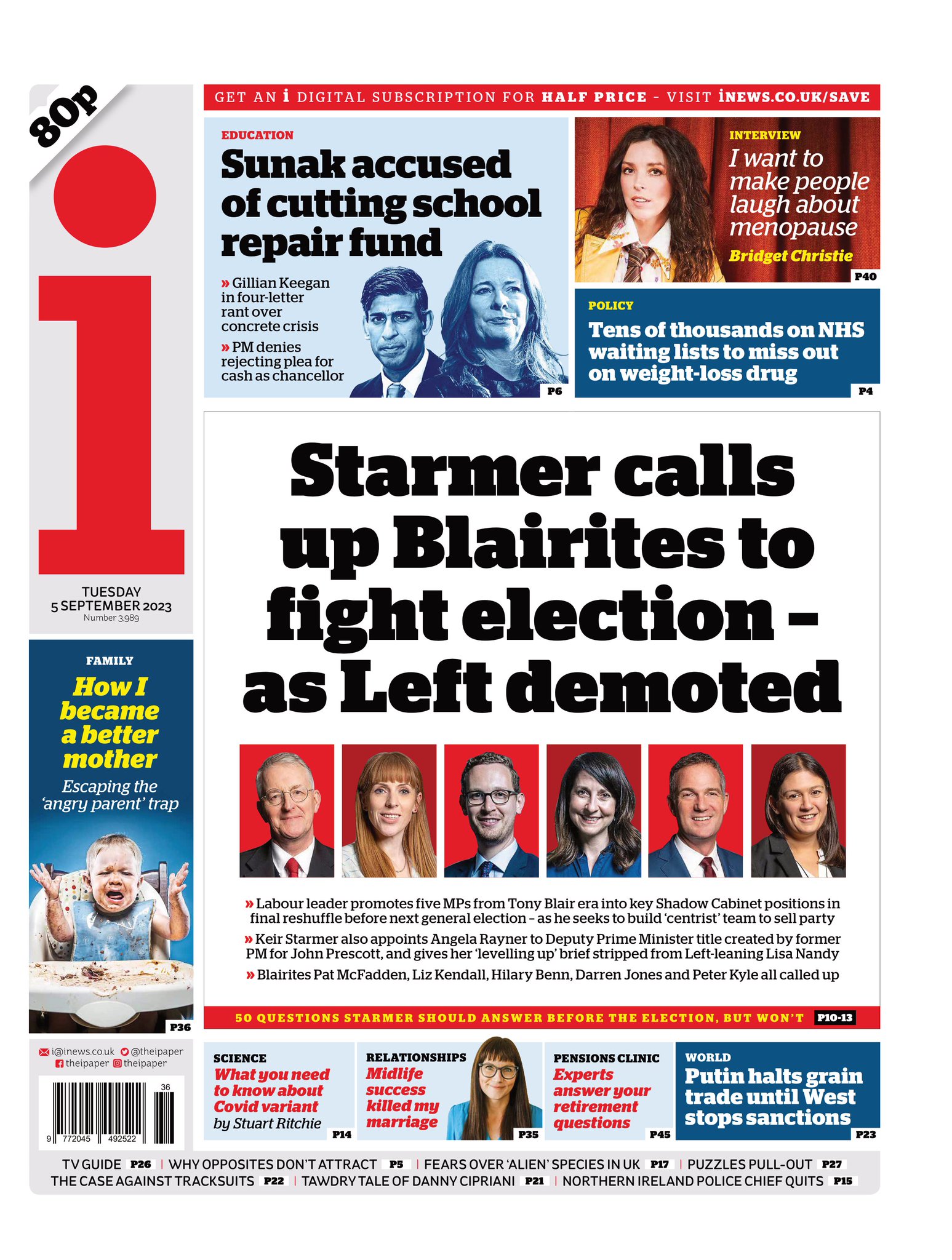 The i reports that Sir Keir Starmer has elevated five Blairite MPs in a Labour reshuffle, aiming to form a more “centrist” team to promote the party.