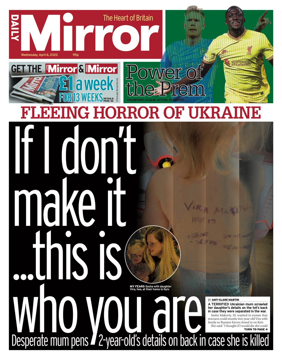 A Ukrainian mother scrawled her details on the back of her daughter’s back, in case they are separated, the Daily Mirror writes.