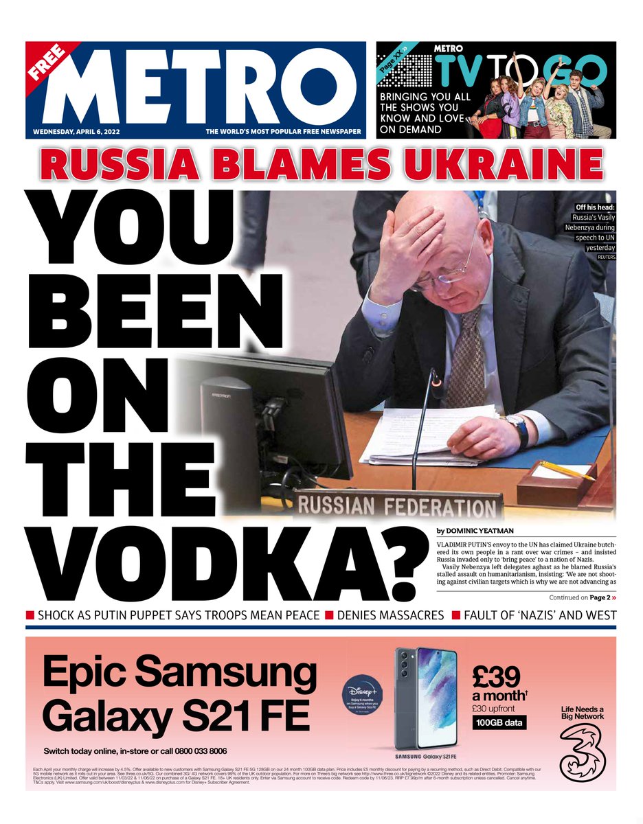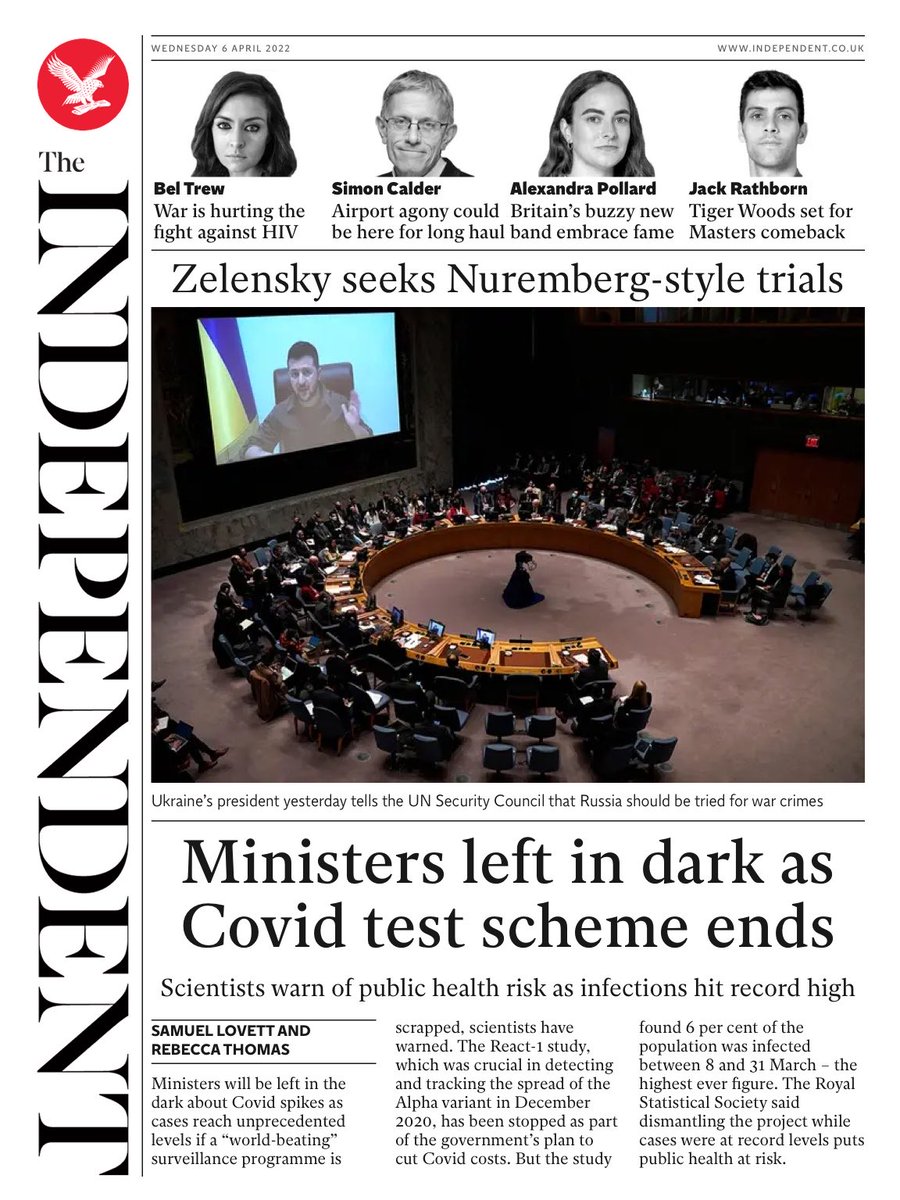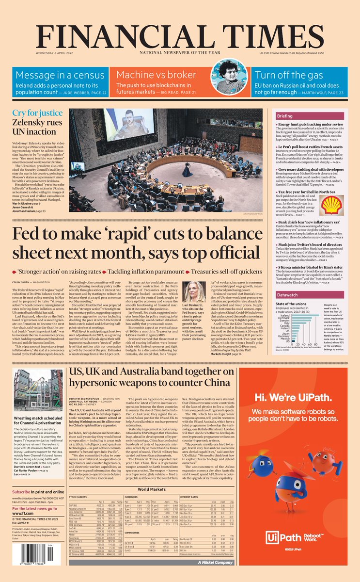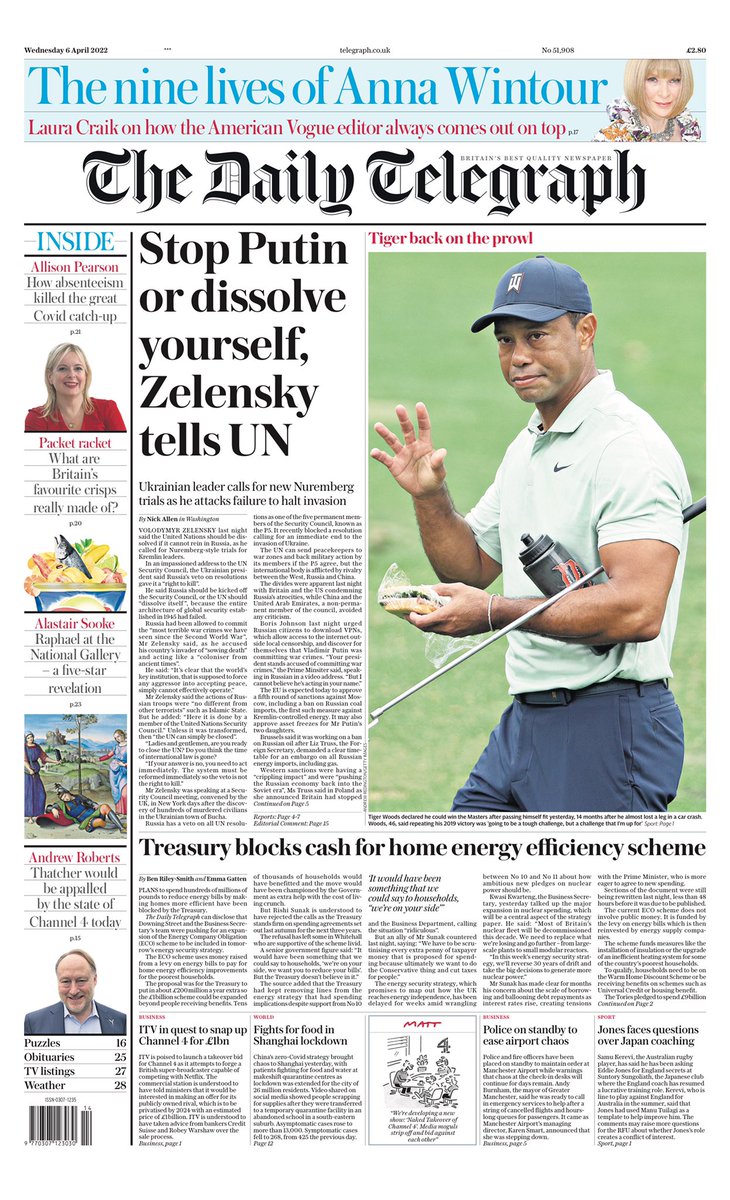 The Financial Times leads on Volodymyr Zelenskyy’s speech to the UN Security Council earlier on Tuesday. Ukraine’s president spoke to the group for the first time and he called for Russian leaders to be “brought to justice” for alleged war crimes.
