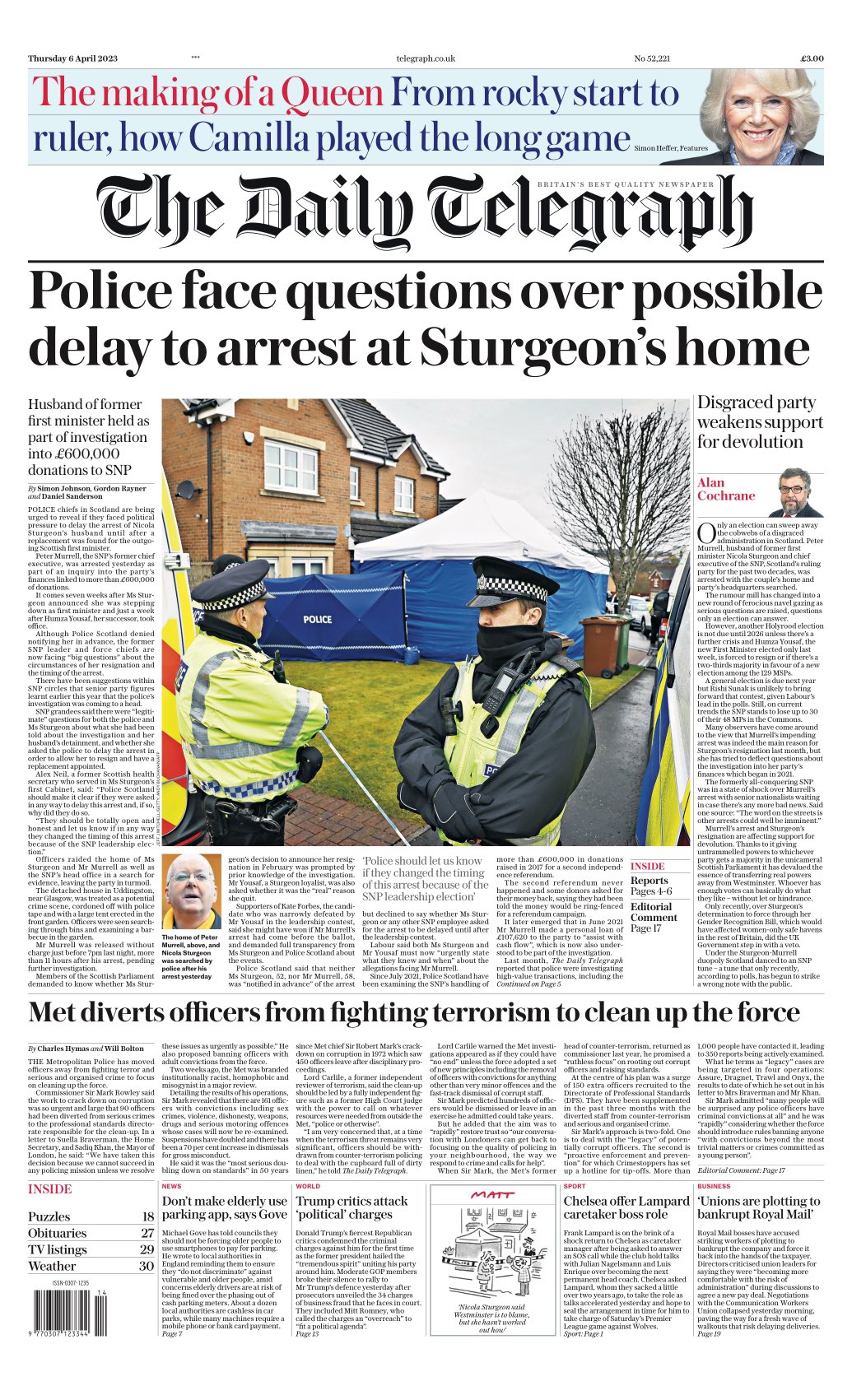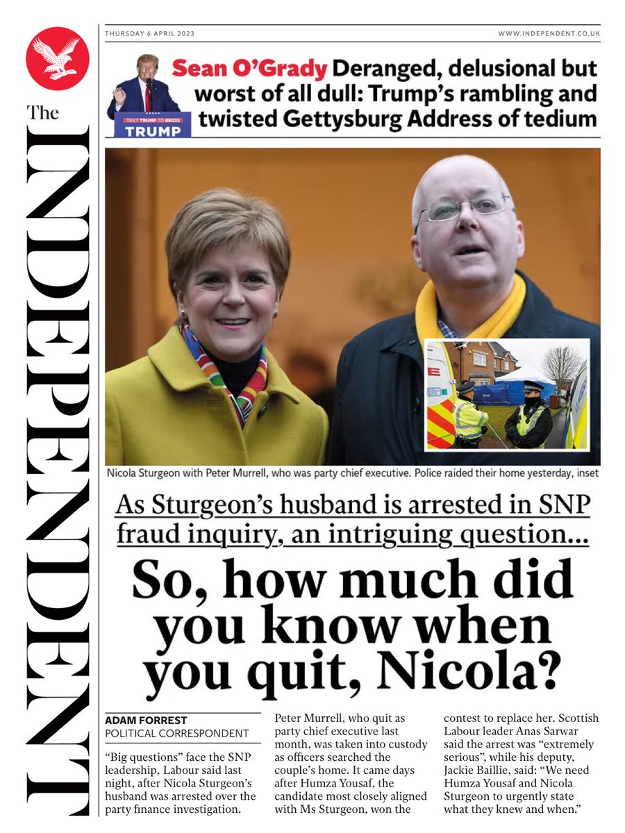 The Daily Mail questions whether Nicola Sturgeon resigned as First Minister because she knew her husband Peter Murrell would be arrested on Wednesday night.
