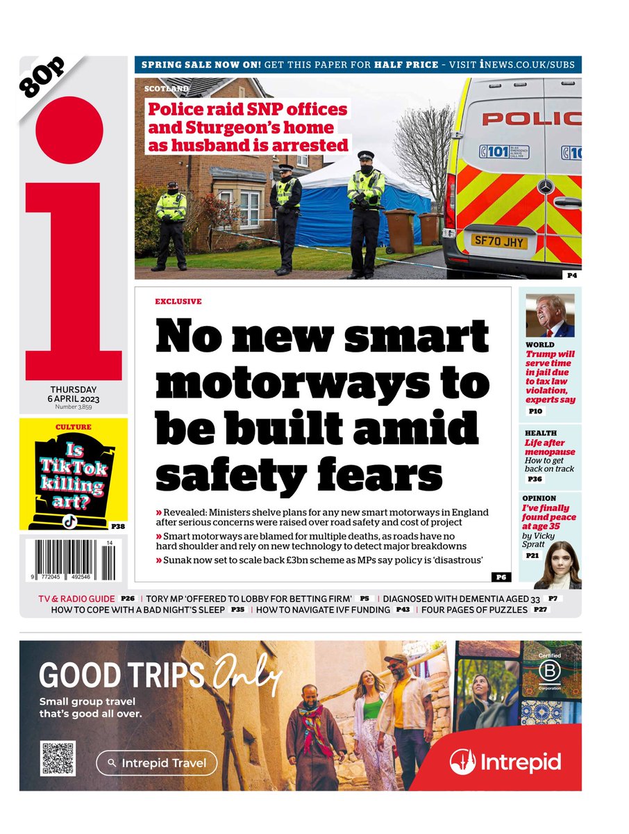 The i reports that ministers have shelved plans for new smart motorways in England due to safety and cost concerns.