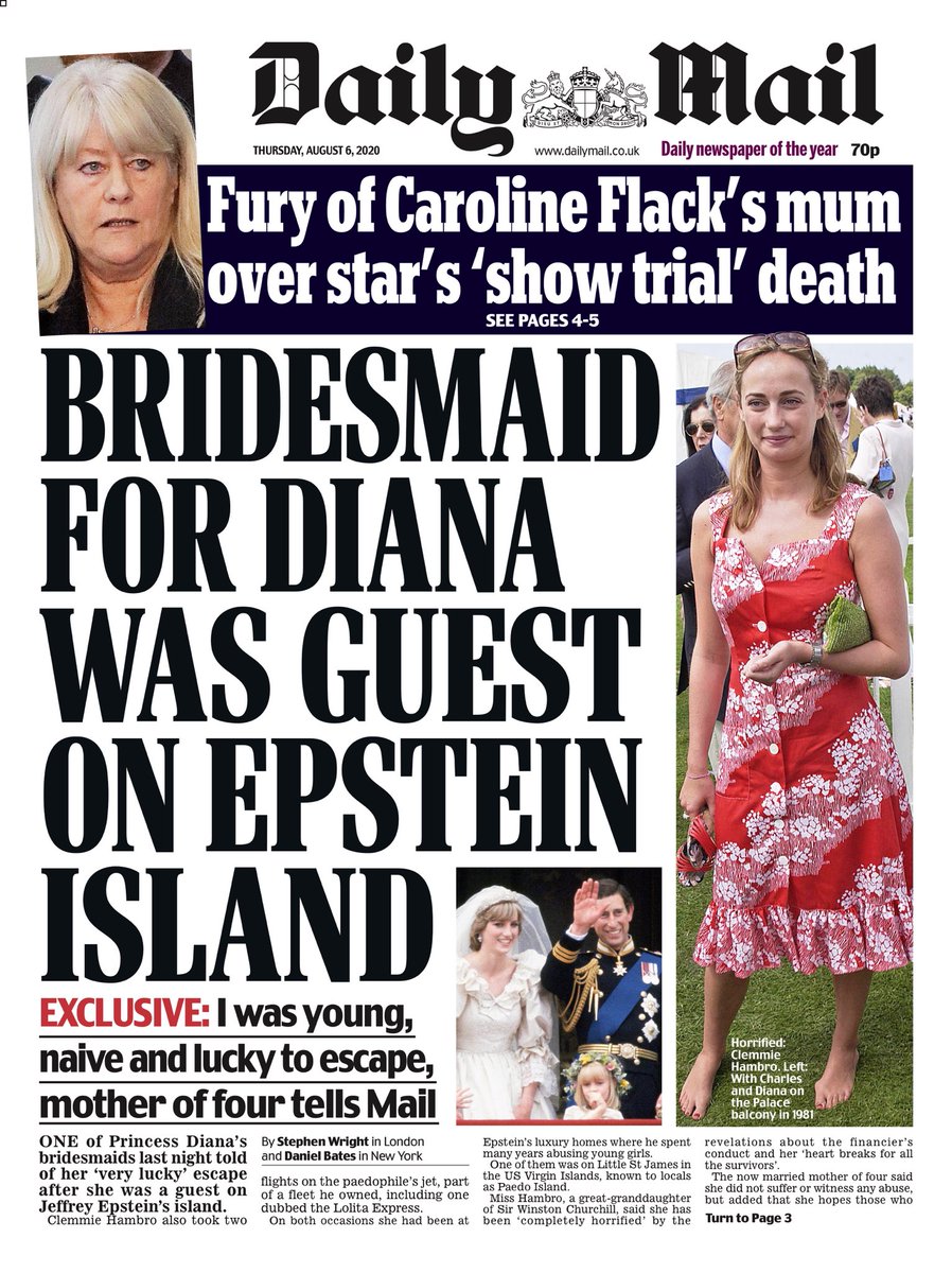 The Daily Mail reports one of Princess Diana’s bridesmaids has told of her “very lucky” escape after she was a guest on Jeffrey Epstein’s island.