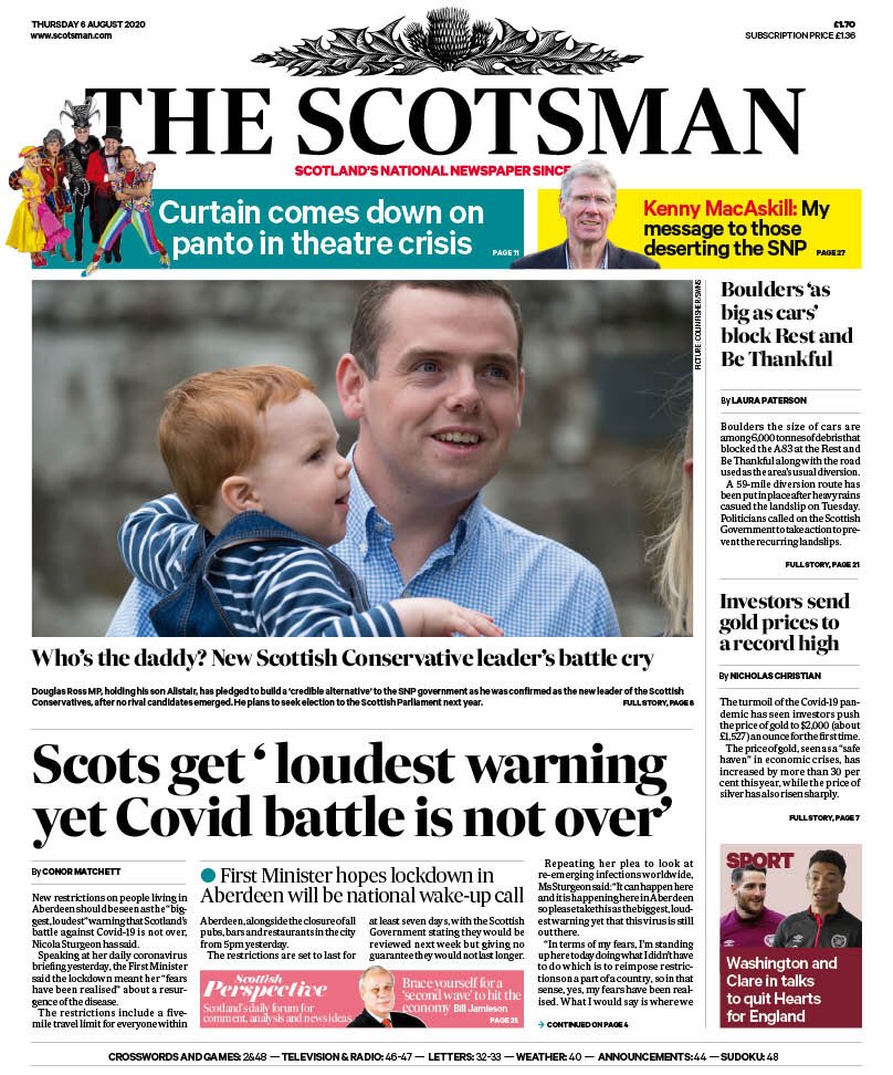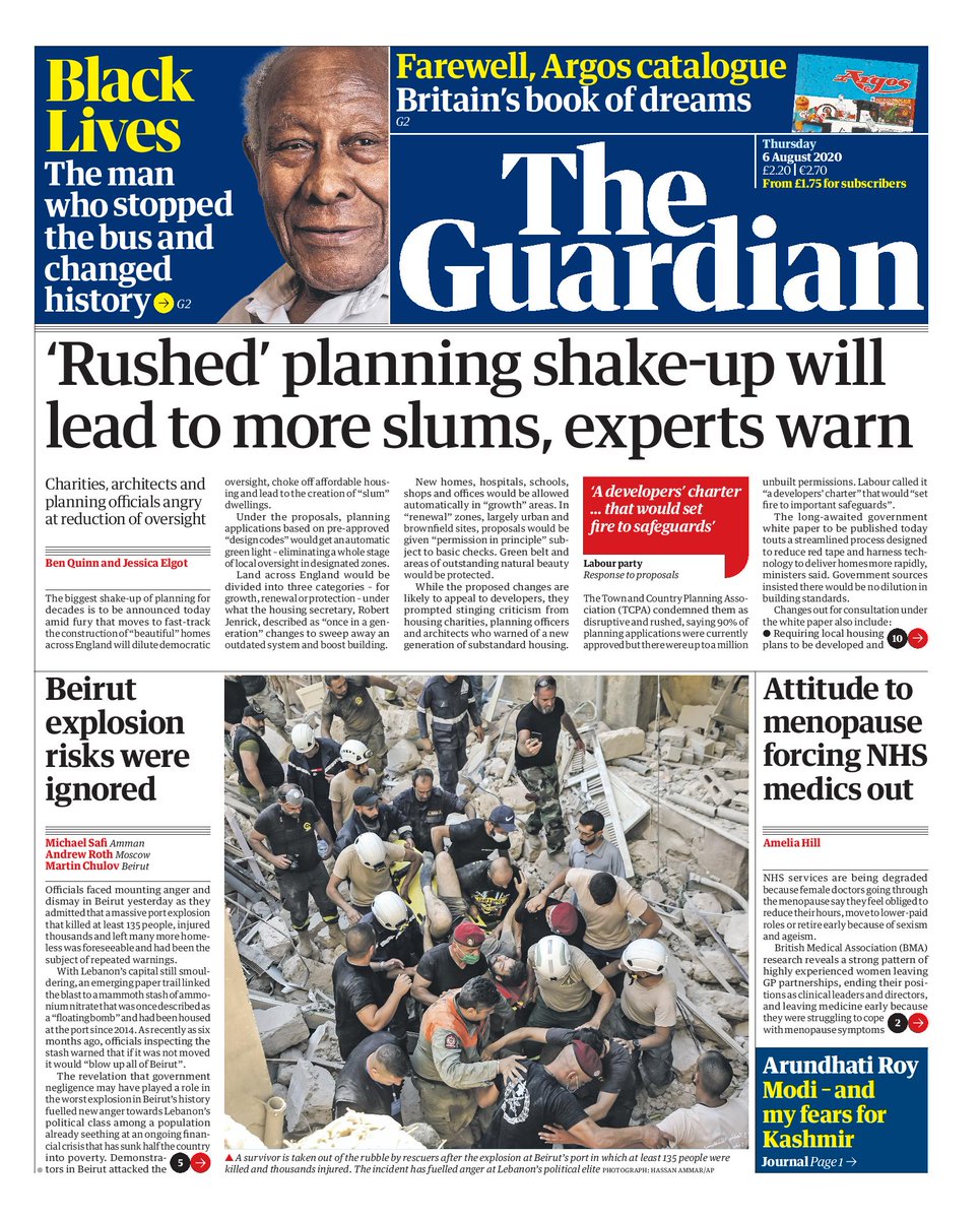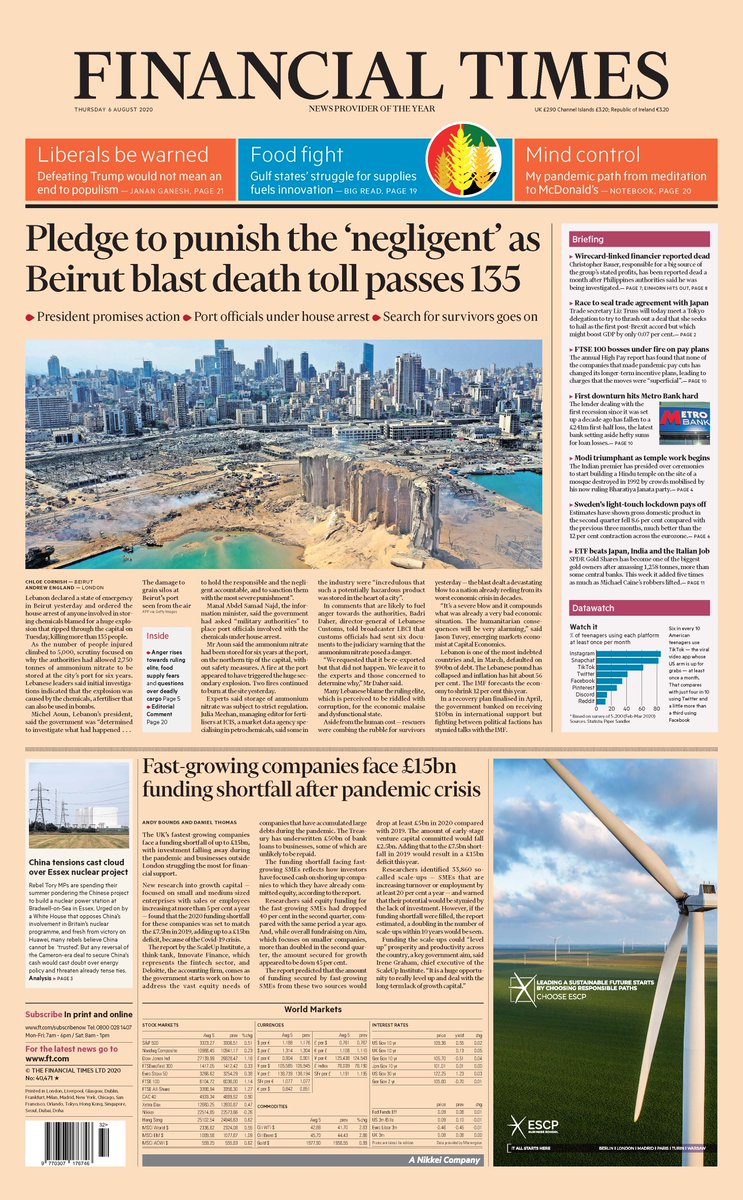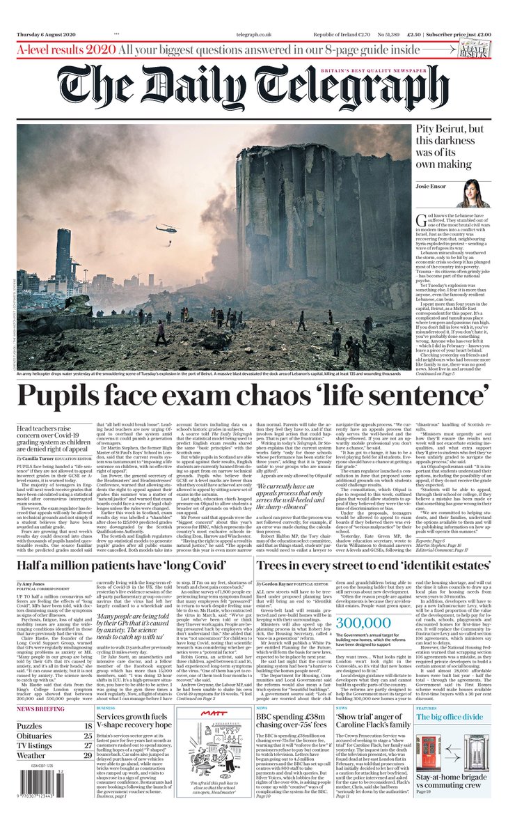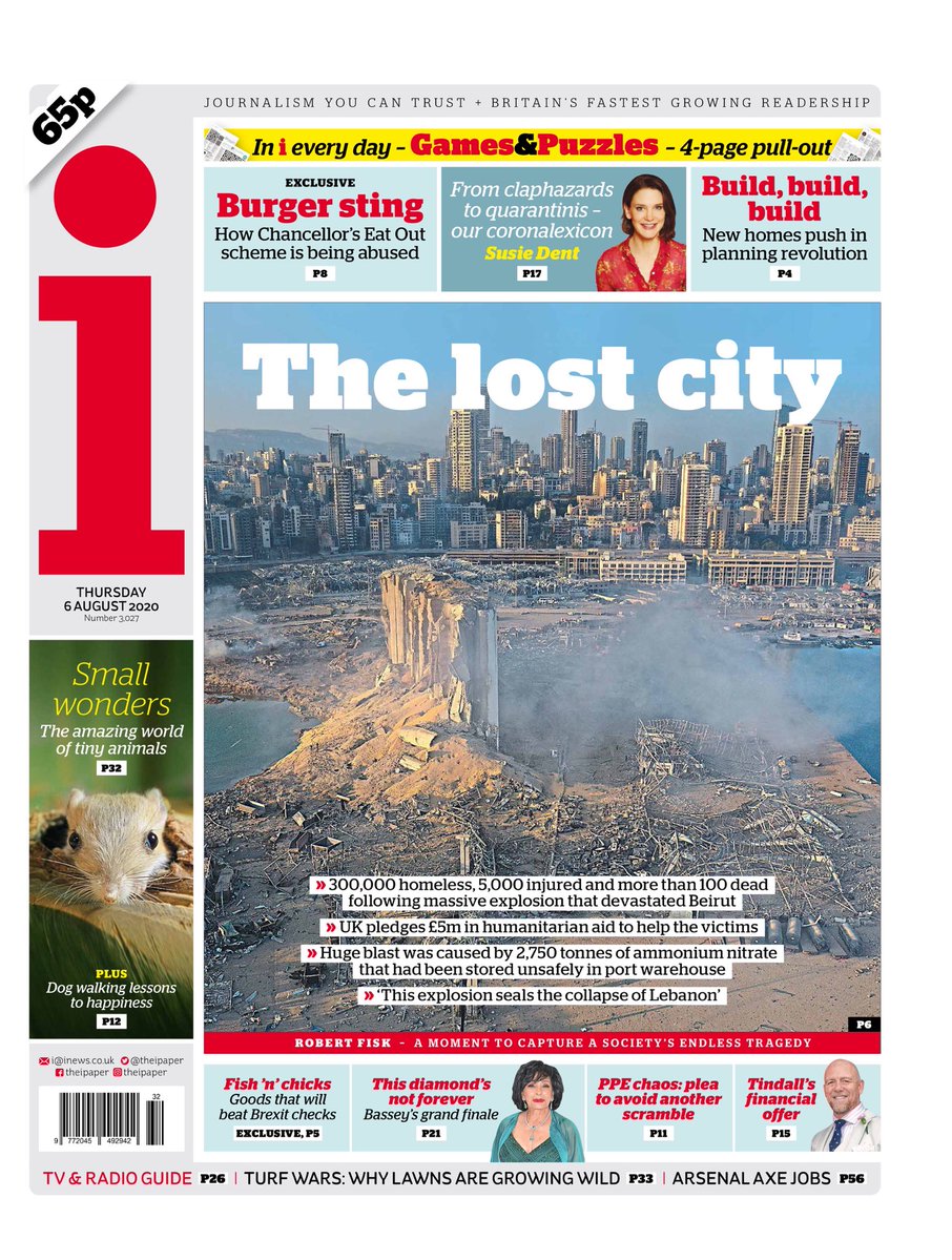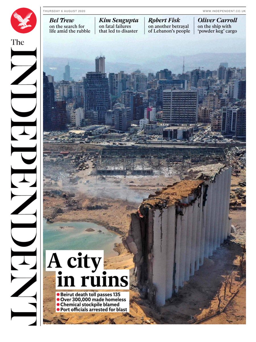 The Independent has a front page picture of the aftermath of a huge explosion in Beirut, which killed at least 135 people and left more than 300,000 homeless.