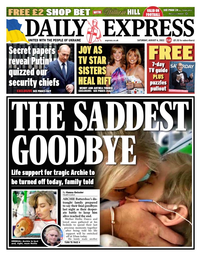The Daily Express reports that Archie Battersbee’s life support will be switched off on Saturday morning.