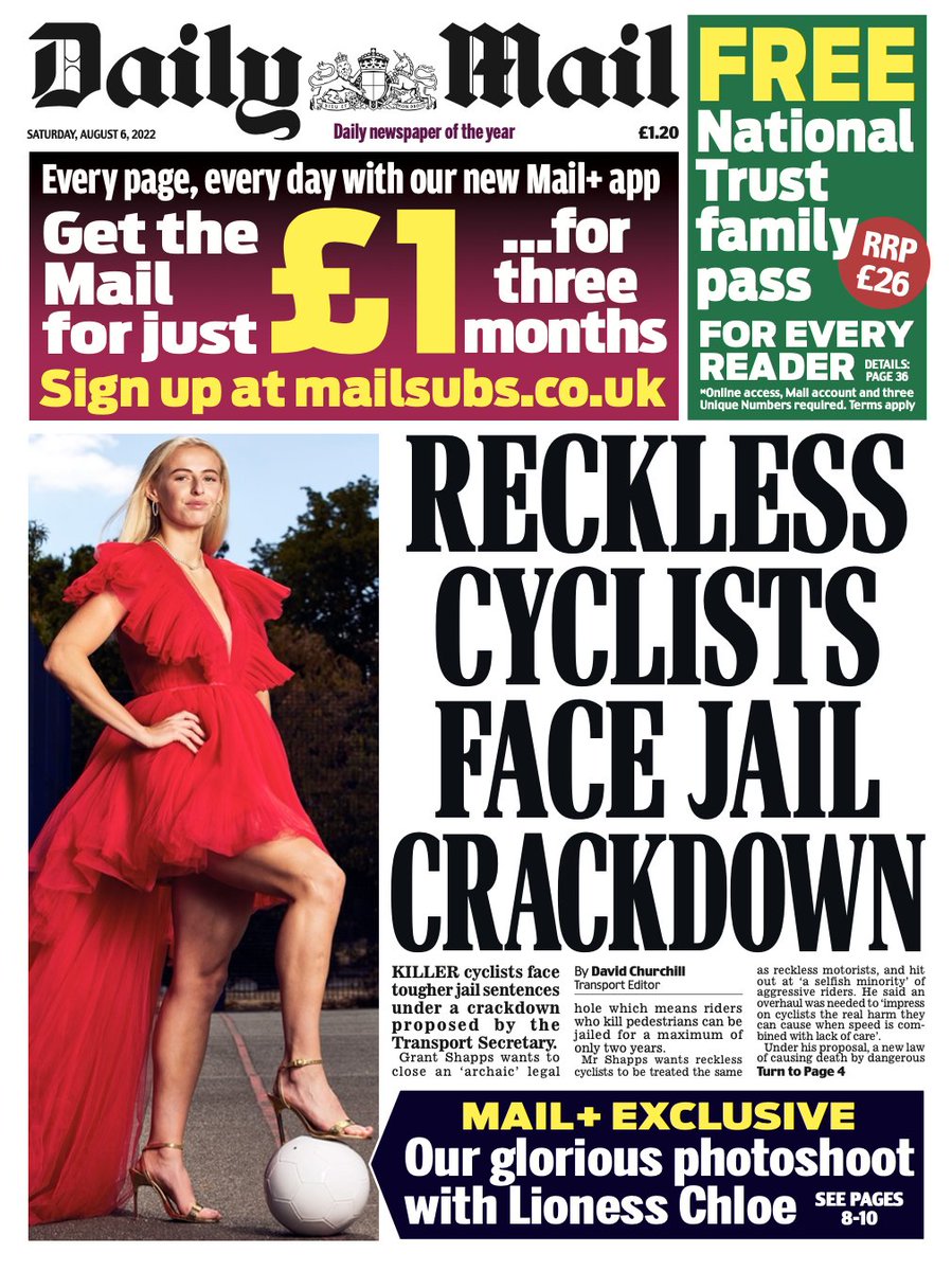 The Daily Mail reports that the transport secretary has proposed tougher sentences for cyclists who kill pedestrians.