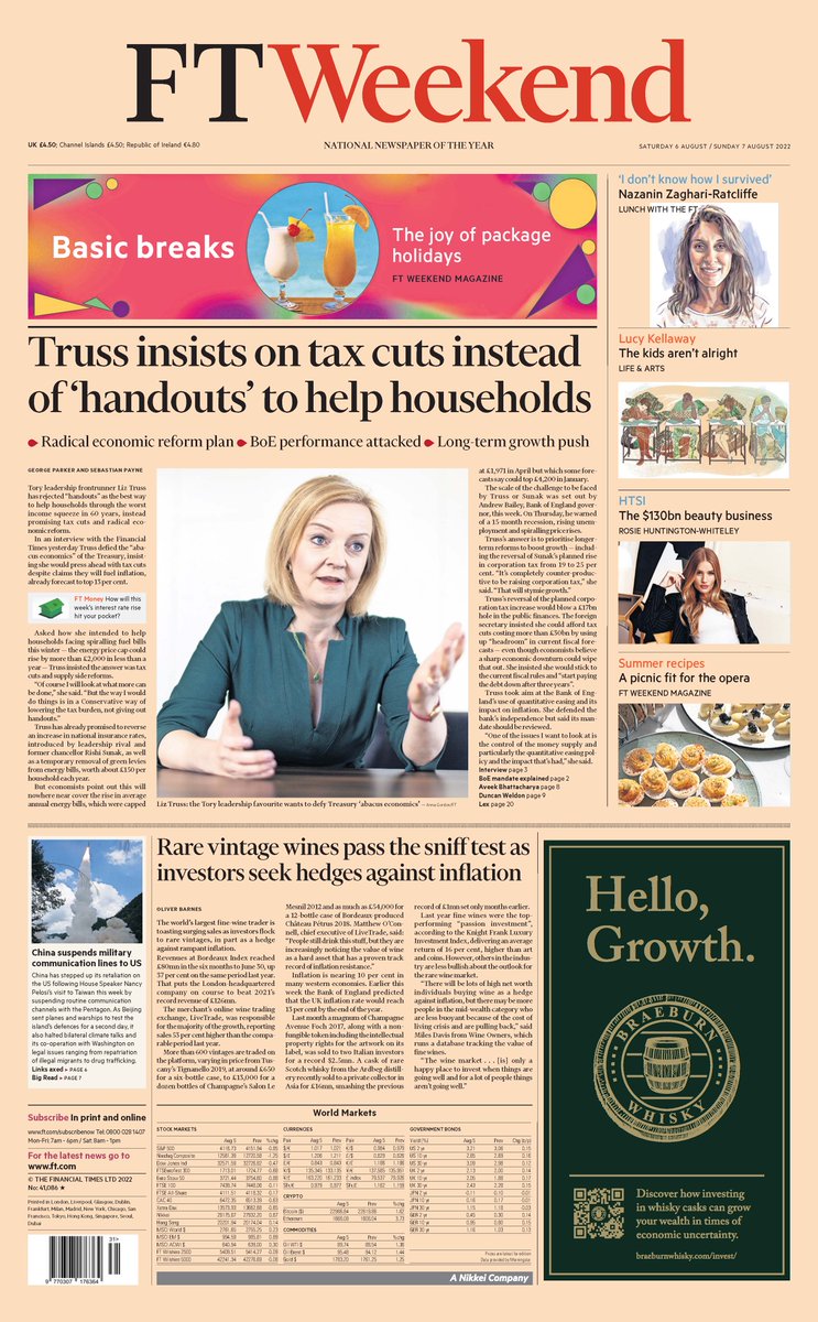 FT reports on Liz Truss’s economic plans, saying the prime ministerial candidate favors tax cuts over handouts.