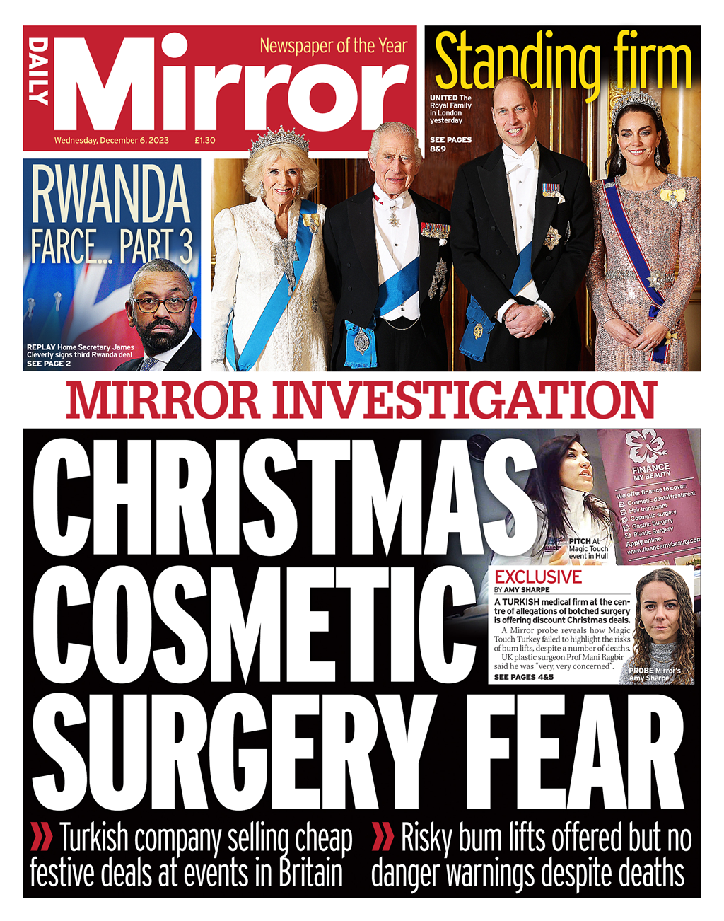 The Daily Mirror highlights a Turkish cosmetic surgery clinic offering Christmas discounts, despite accusations of fatal and flawed procedures.