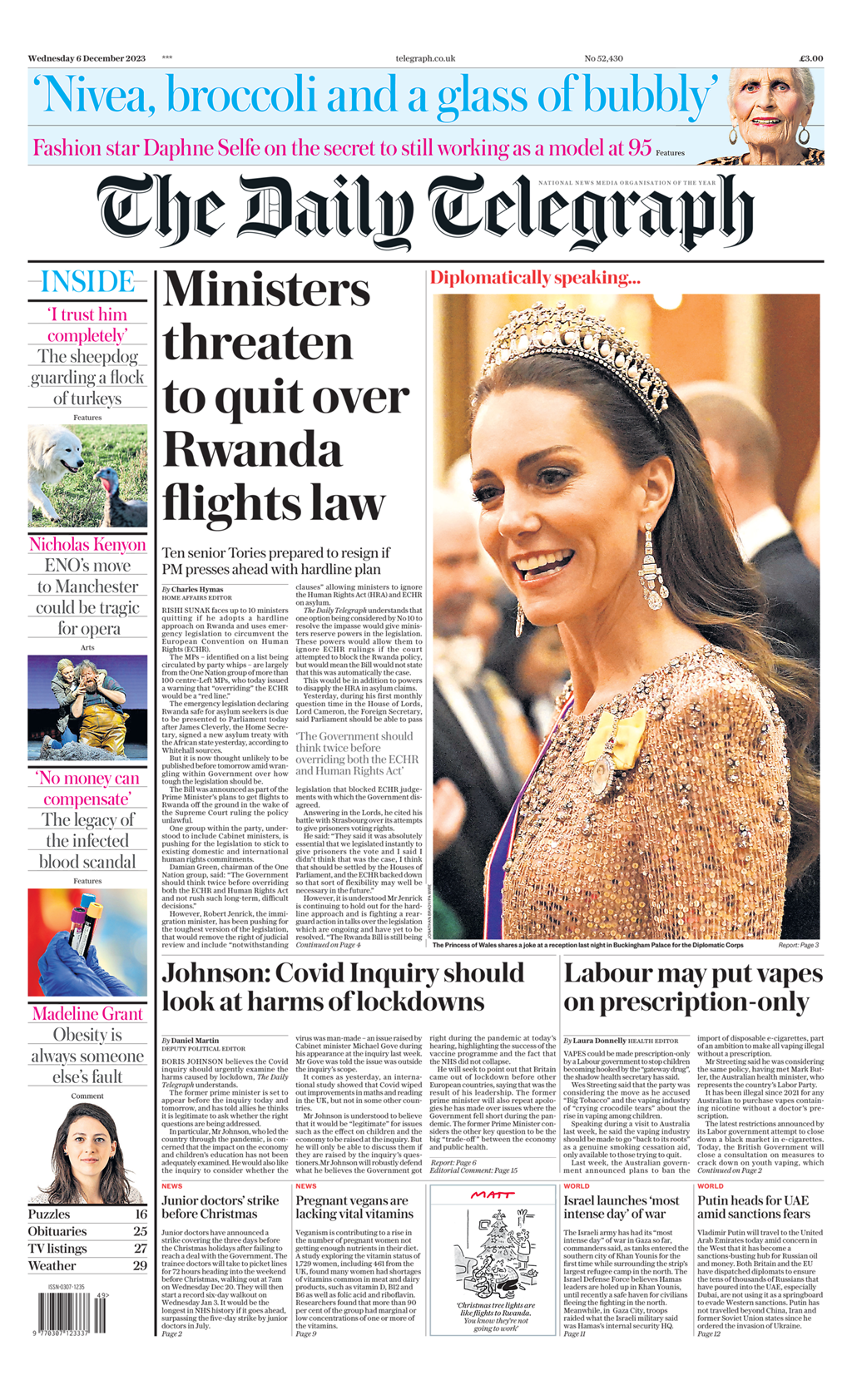 The Daily Telegraph reports on the potential resignation of ten senior Tories if Rishi Sunak bypasses the ECHR to initiate Rwanda deportation flights.
