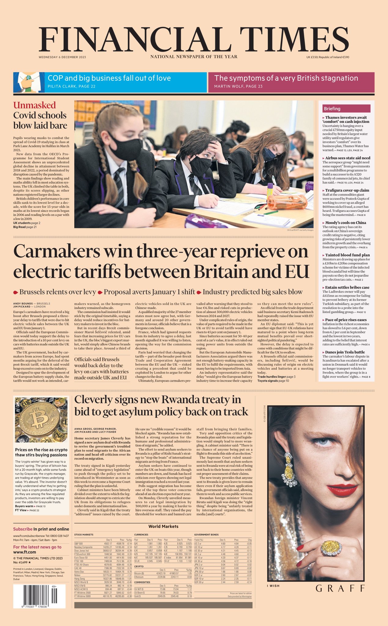 The Financial Times highlights Brussels’ proposal to postpone the electric car tariffs between the UK and EU for three years.