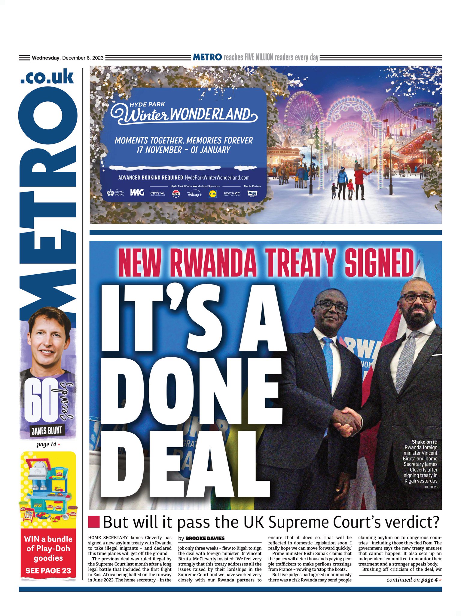 The Metro reports on James Cleverly and Vincent Biruta’s handshake marking the UK’s new asylum treaty with Rwanda.
