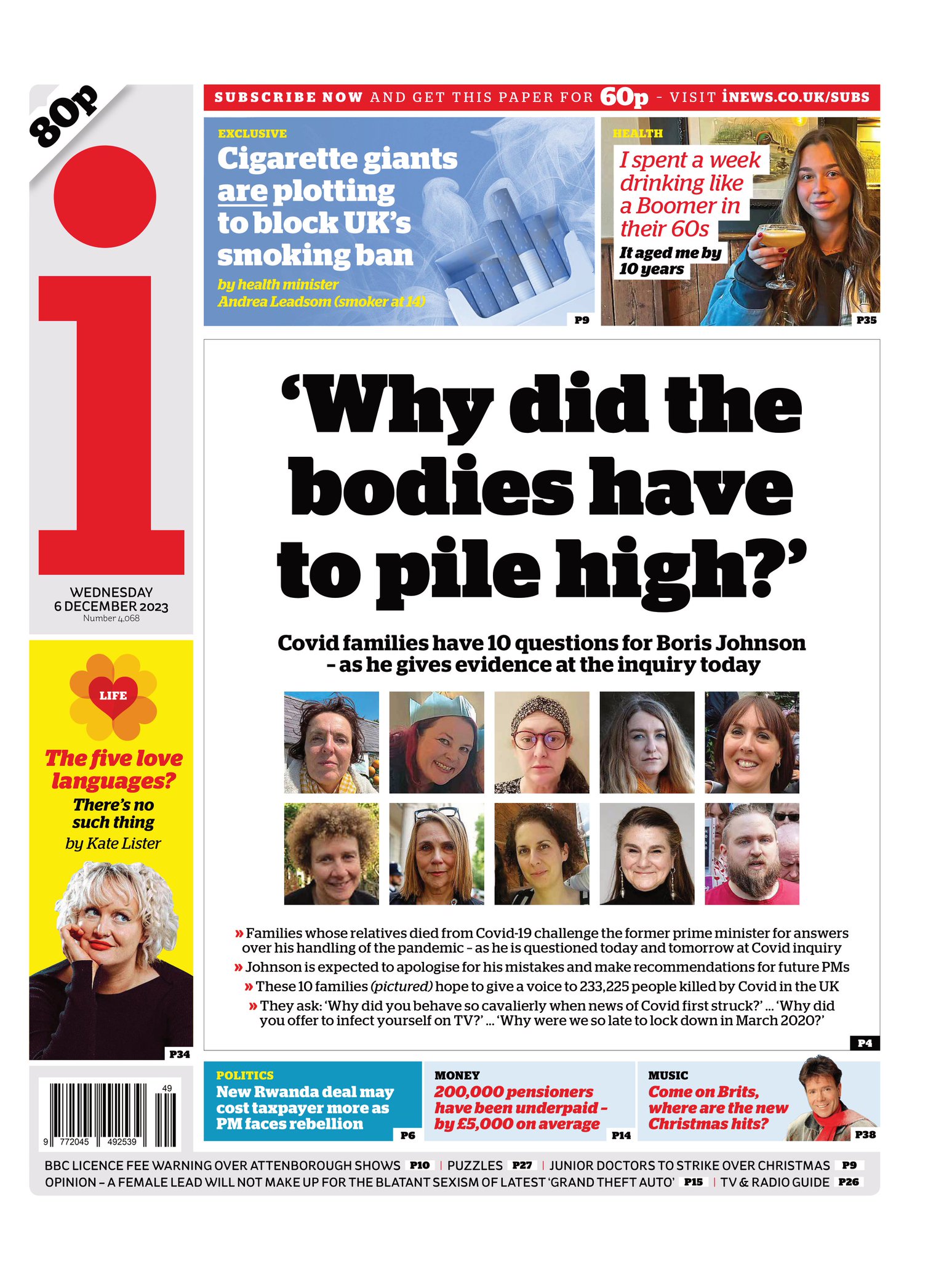 The i newspaper focuses on families bereaved by COVID-19 before Boris Johnson’s inquiry appearance.