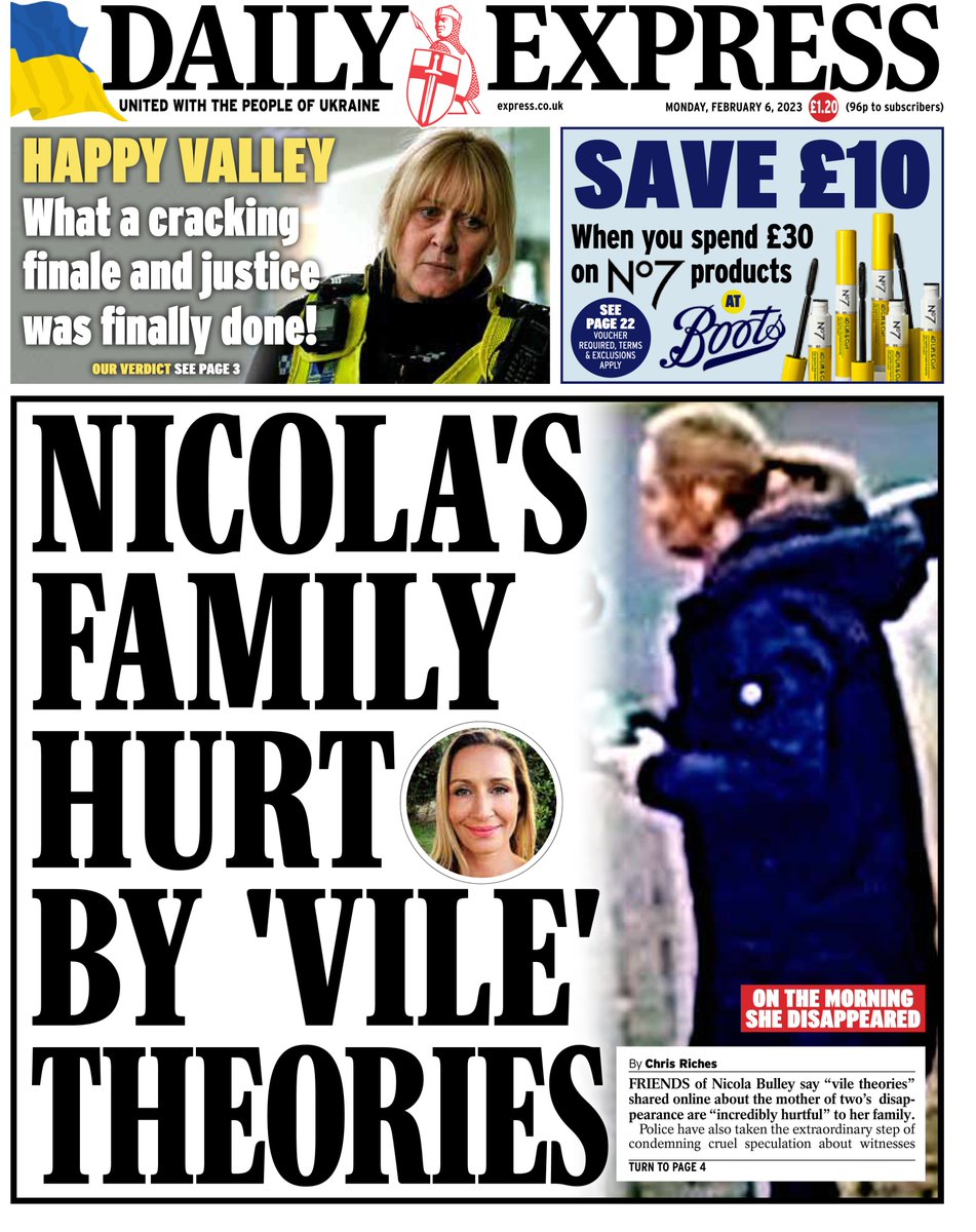 In The Daily Express, friends and family of missing Nicola Bulley say they have been hurt by “vile theories” spreading online.