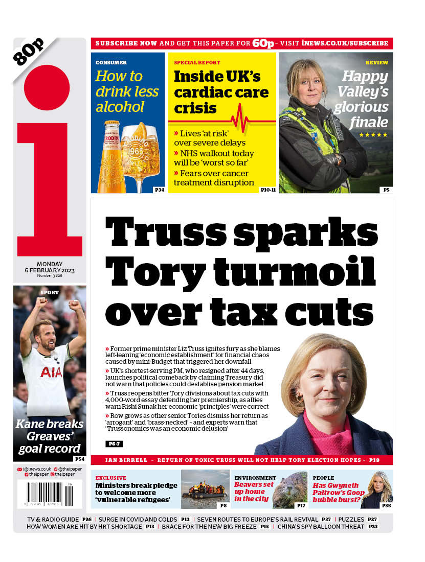 The i reports that the former prime minister’s Sunday Telegraph article sparked “Tory turmoil over tax cuts”.