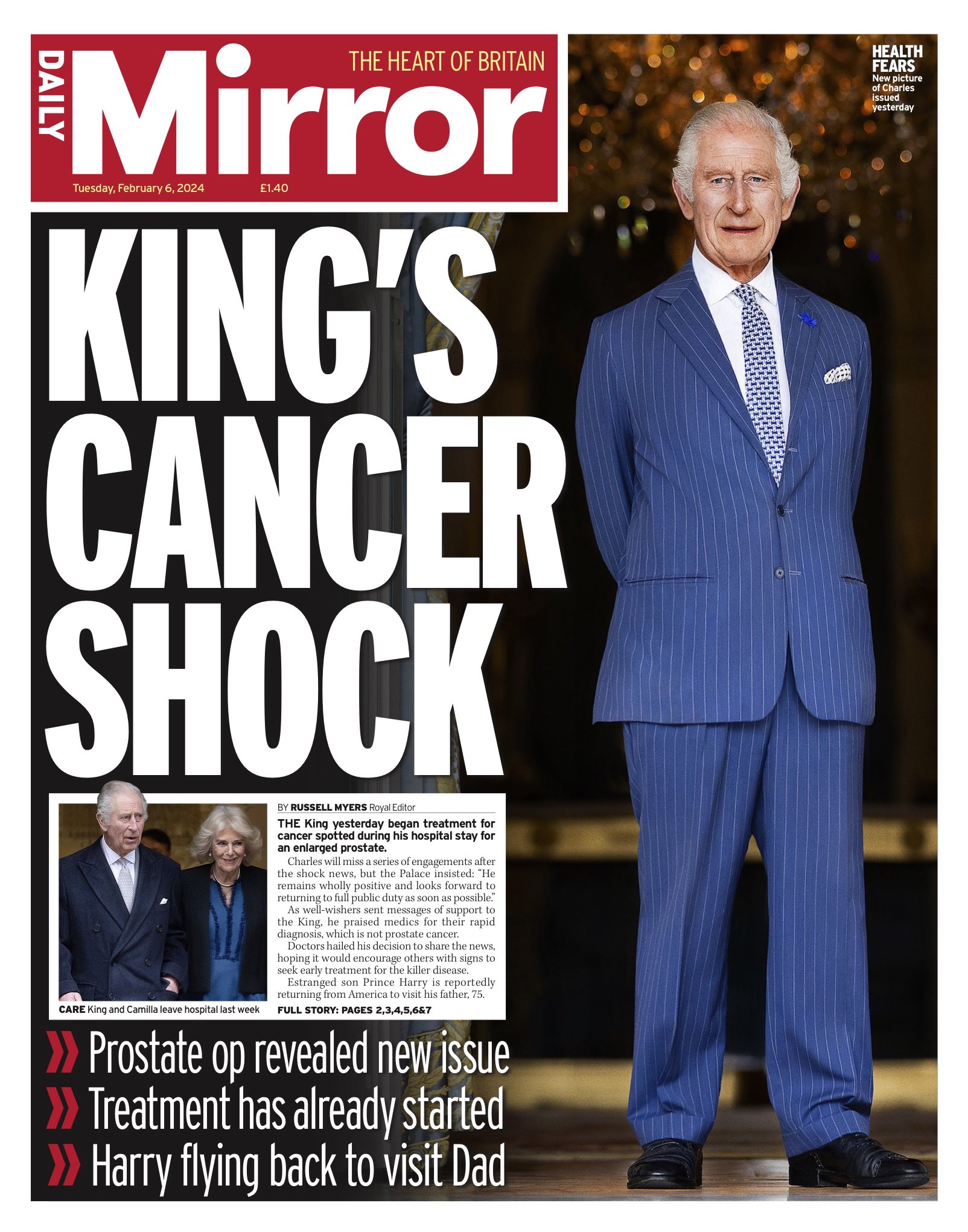 The Daily Mirror headlines the King’s cancer diagnosis and subsequent cancellation of royal engagements.