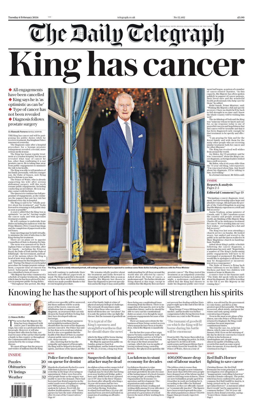 The Daily Telegraph unveils the King’s cancer diagnosis news on its main page.