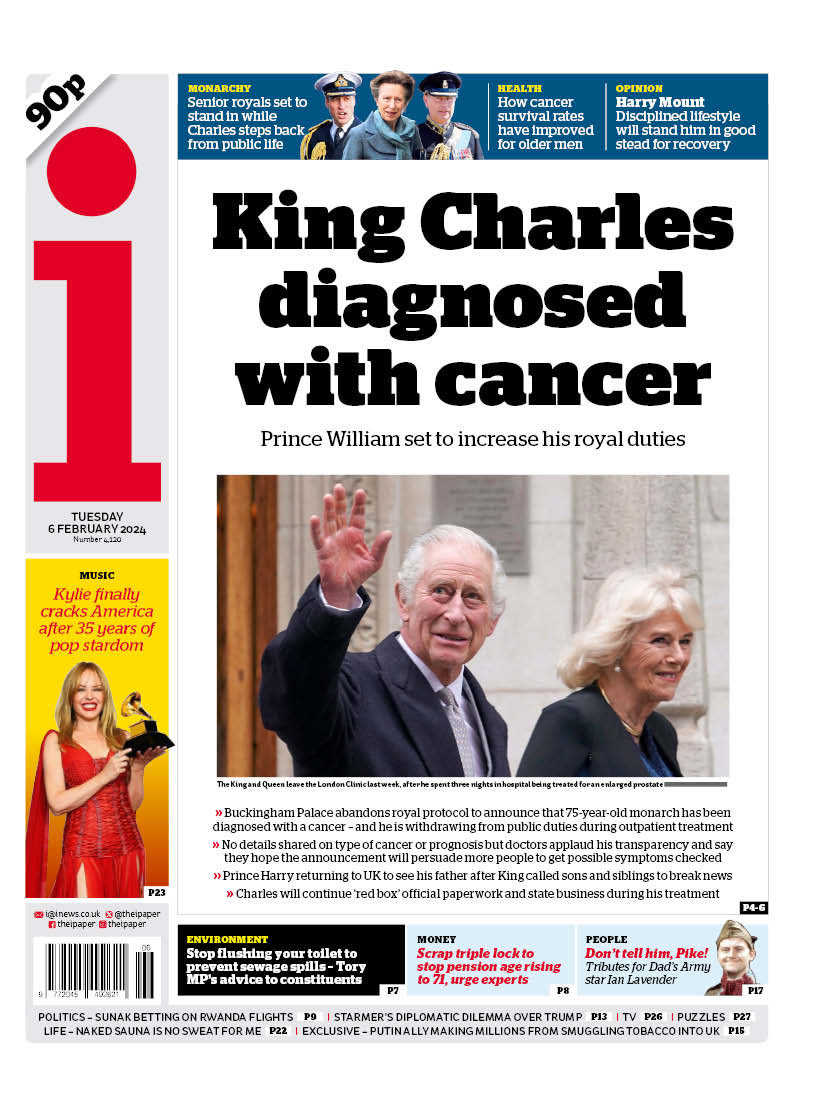 The i paper reports Prince William’s increased royal duties due to the King’s cancer diagnosis.
