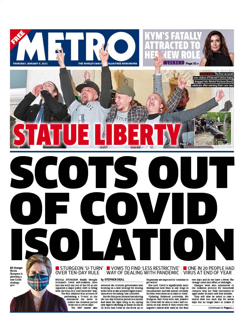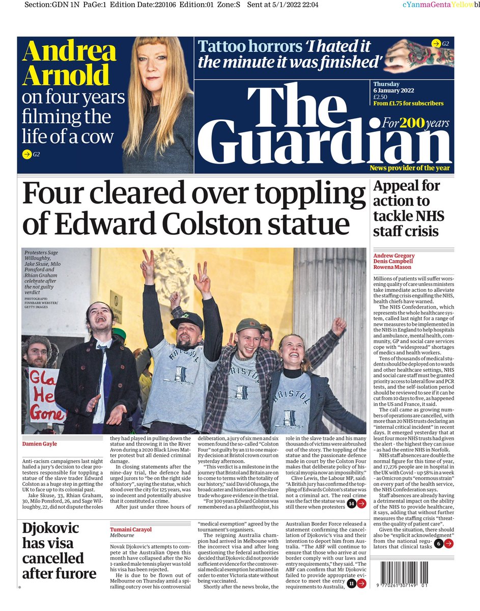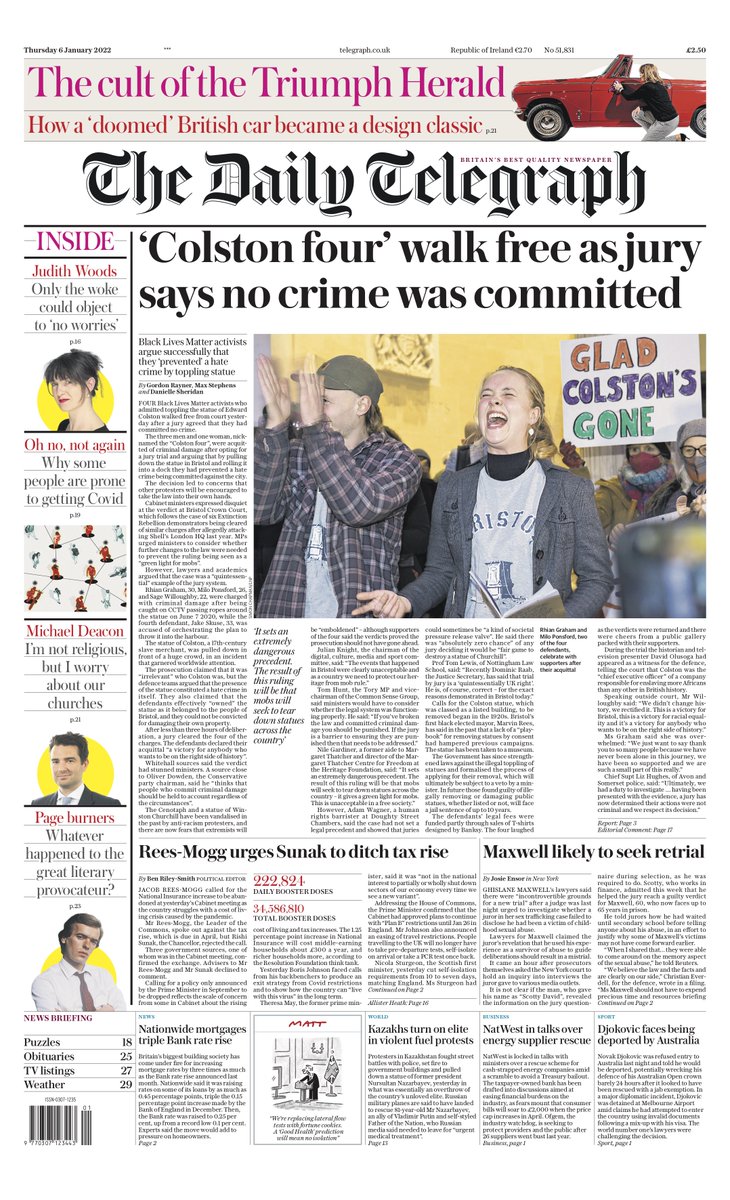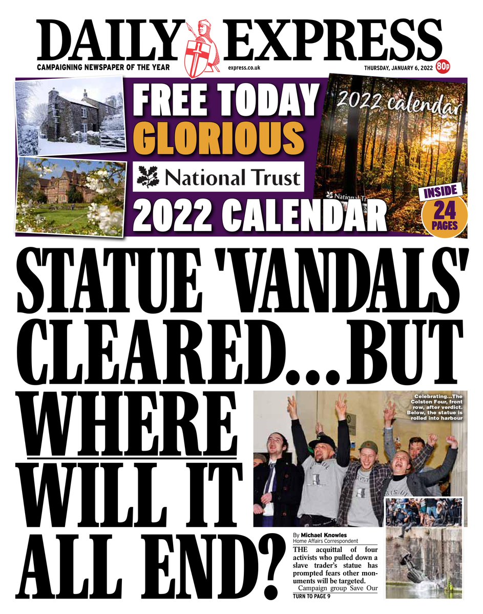 The Telegraph says four Black Lives Matter activists who admitted toppling the statue of Edward Colston in Bristol walked free from court after a jury “agreed they had committed no crime”.