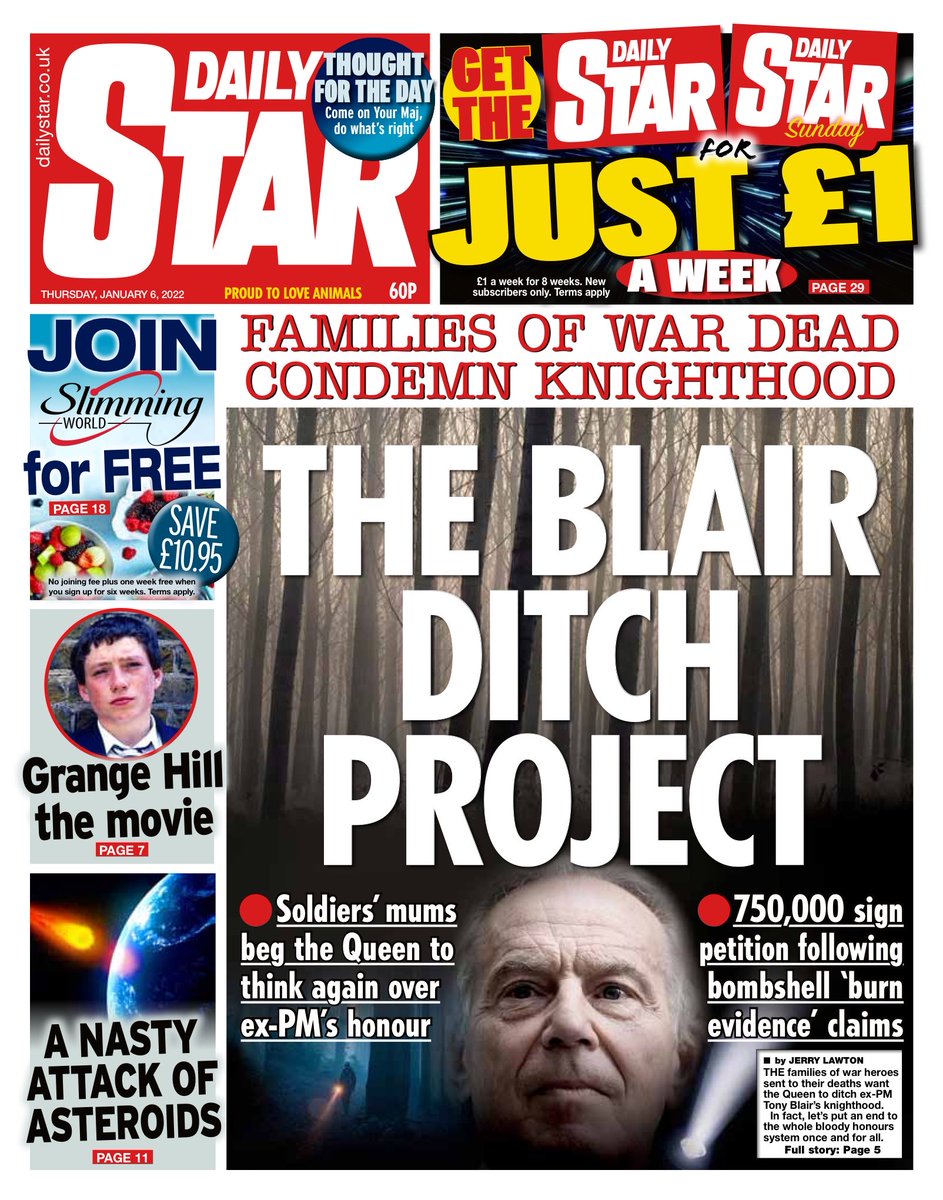 The Daily Star focuses on a campaign to stop Tony Blair receiving a knighthood.