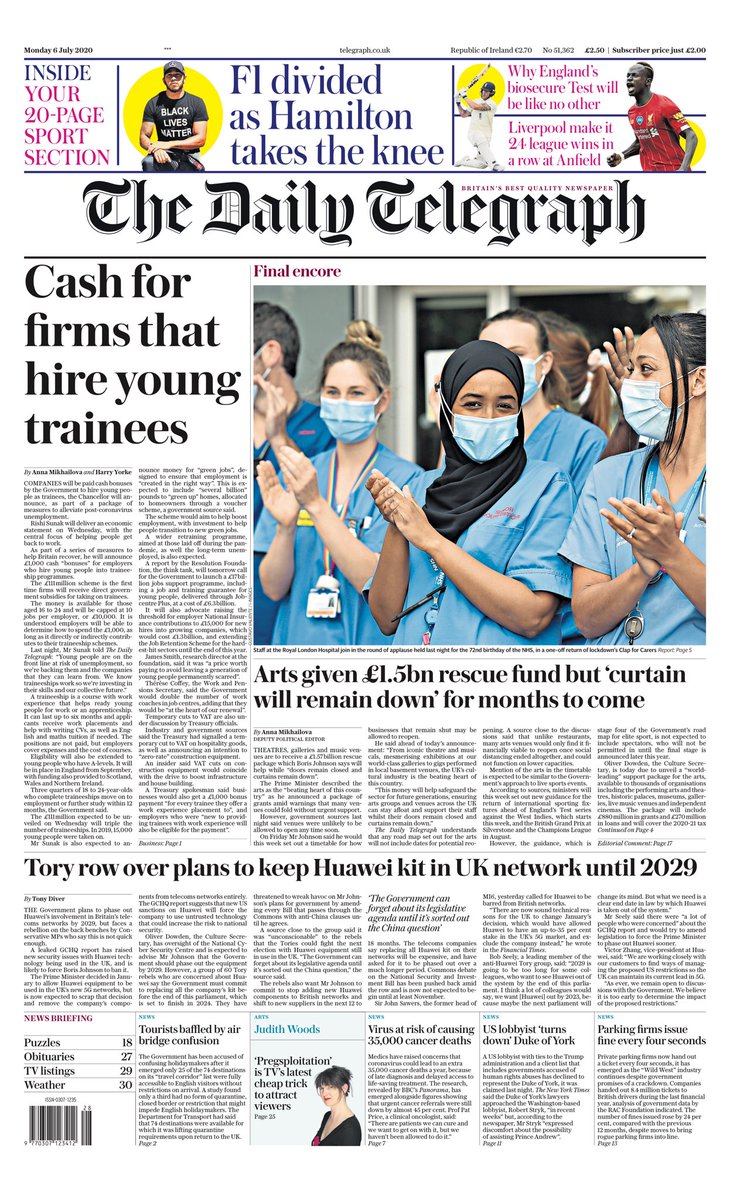 Companies will be paid cash bonuses to hire young people as trainees as part of government plans to “alleviate post-coronavirus unemployment”, The Daily Telegraph reports.