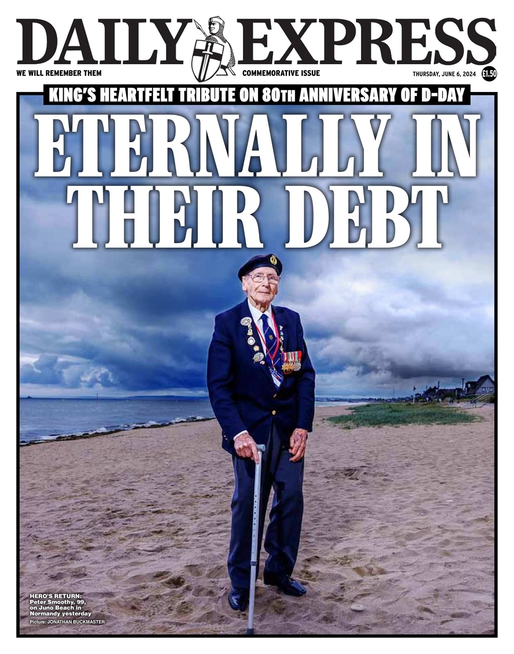 The Daily Express’ front page highlights the D-Day commemorations, featuring a touching image of a veteran on Juno Beach.
