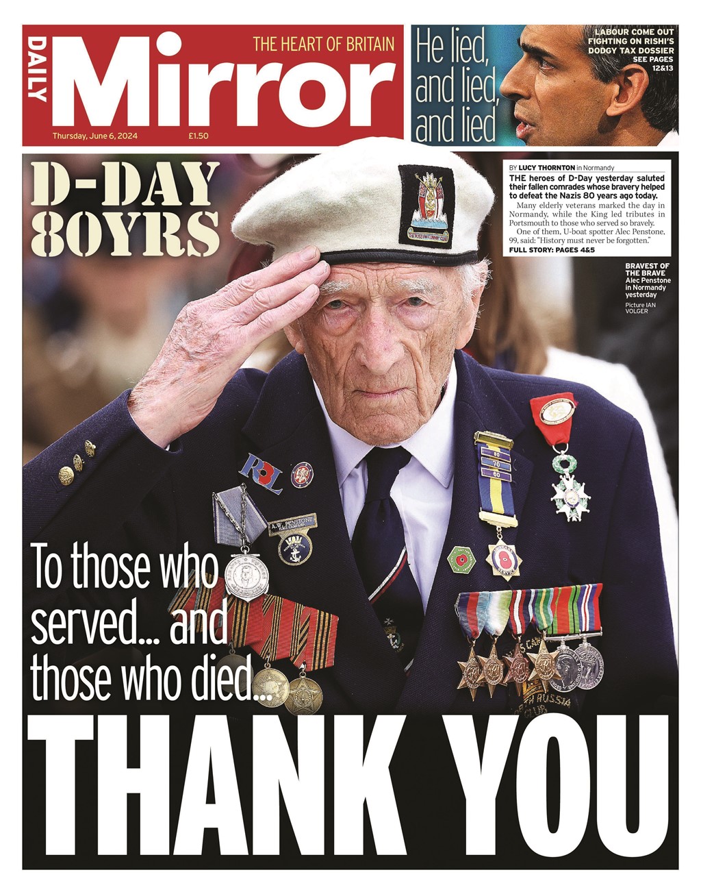 The Daily Mirror highlights the tribute paid by D-Day heroes to their fallen comrades who aided in defeating the Nazis 80 years ago.
