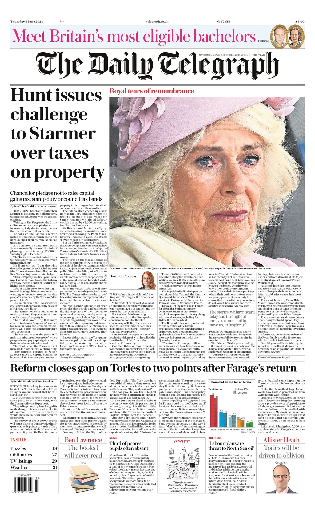 Jeremy Hunt, in The Daily Telegraph, urges Sir Keir Starmer to promise no property tax hikes if Labour triumphs in the election.