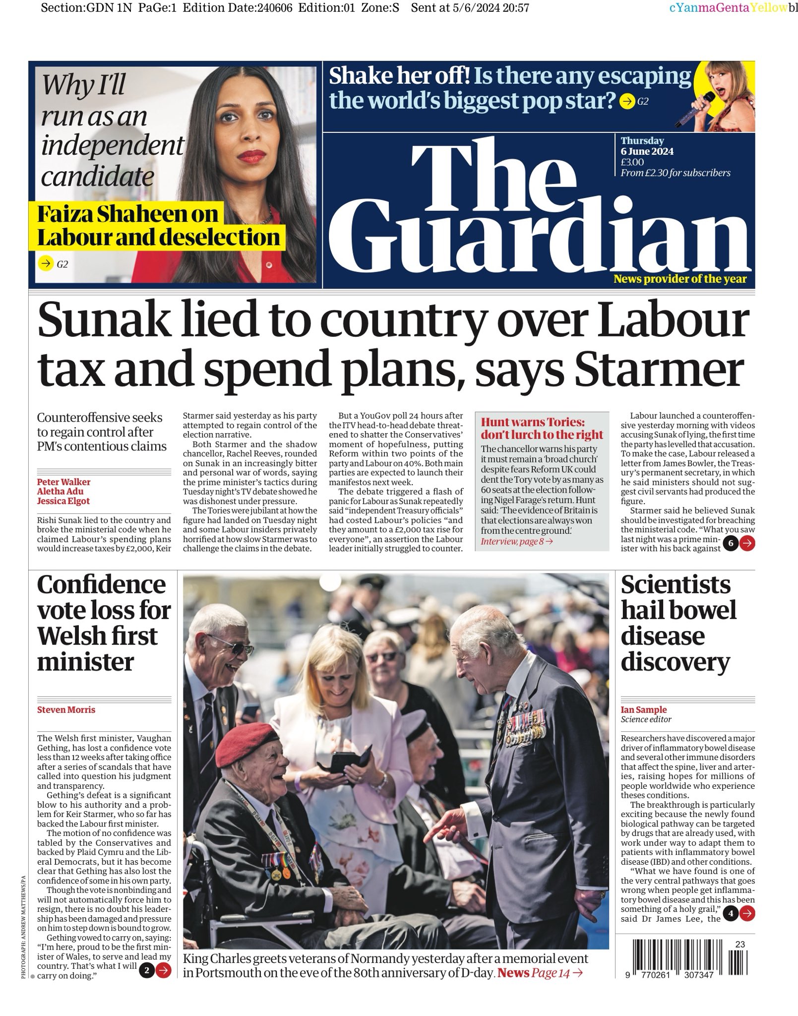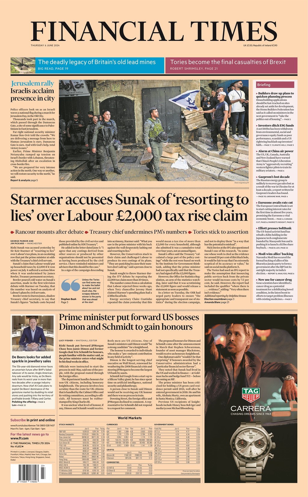 The Financial Times highlights the row between Rishi Sunak and Sir Keir Starmer over Labour’s tax plans.